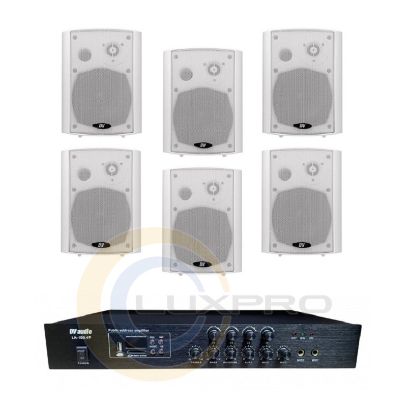 Акустический комплект LA1006PB5TW. Акустическая система DV audio PB-5.2TW. Двухполосная акустическая система для передачи звукового сигнала в помещениях ресторанов, торговых центров, кафе, отелях, офисах, спортивных клубах. Требует настенного монтажа. Пластиковый корпус с металлической решеткой, монтажный кронштейн в комплекте. Несколько режимов работы. Имеет уровень защиты IP65, что позволяет использовать эти системы на улице (OUTDOOR).