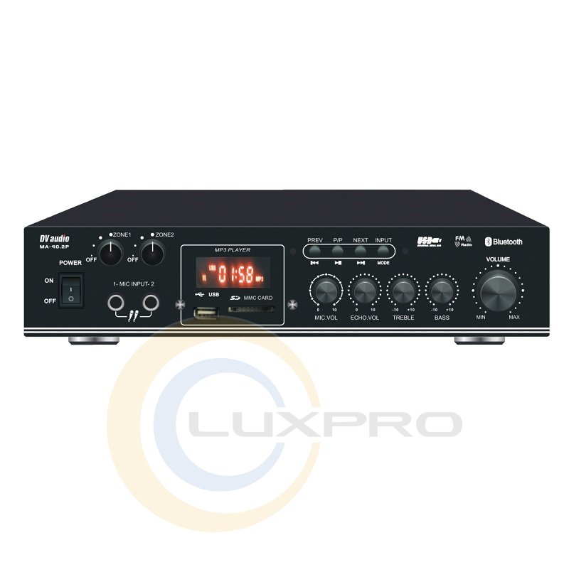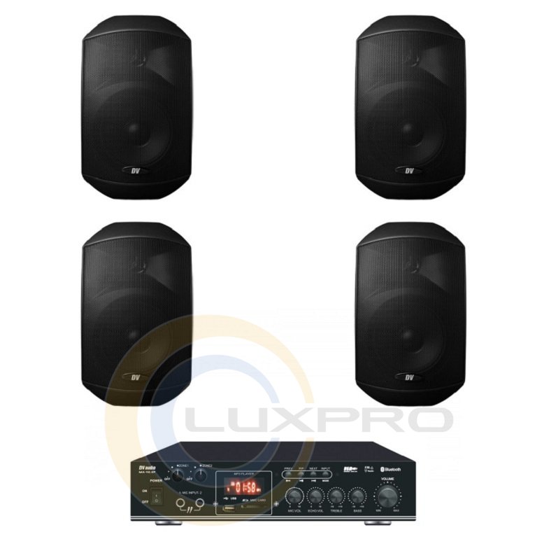 Акустический комплект MA404MS4B. Микширующий усилитель мощности DV audio MA-40.2P со встроенным USB-проигрывателем и FM-тюнером , а так же возможностью воспроизведения через BLUETOOTH. Применяется в системах фонового озвучивания. Оснащен двумя микрофонными входами, двумя линейными входами и линейным выходом. Управление USB-проигрывателем осуществляется с помощью кнопок stop/play, повтор, предыдущий трек, следующий трек с лицевой панели усилителя. USB-проигрыватель поддерживает USB-флешки максимальным объемом памяти до 16гб. Управление FM-тюнером осуществляется так же с лицевой панели усилителя или с дистанционного пульта управления. Усилитель выполнен в компактном корпусе высотой 1,5U для монтажа в рэковую стойку не предназначен.