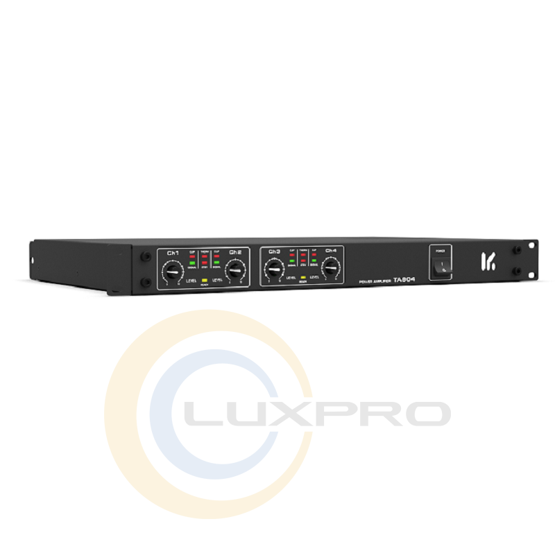 TA804 MkII - усилитель мощности имеет импульсный источник питания, естественное охлаждение, функцию Auto-standby с возможностью отключения, входные/выходные соединители Euroblock, индикаторы сигнала, перегрузки и термозащиты. Регуляторы уровня усиления передней панели. Корпус 1U. Вес: 4,2кг.