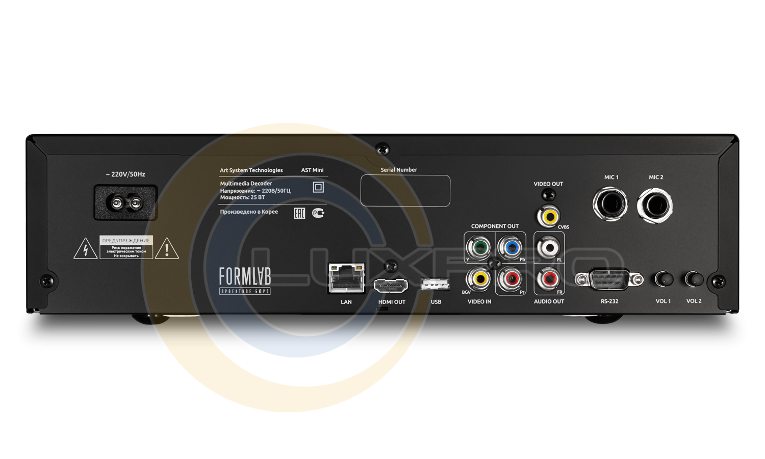 - входы: 1 х композитный, 2 х микрофонный (Jack 1/4"), 2 x USB 2.0, 1 x RJ45 (LAN), 1 x RS-232;