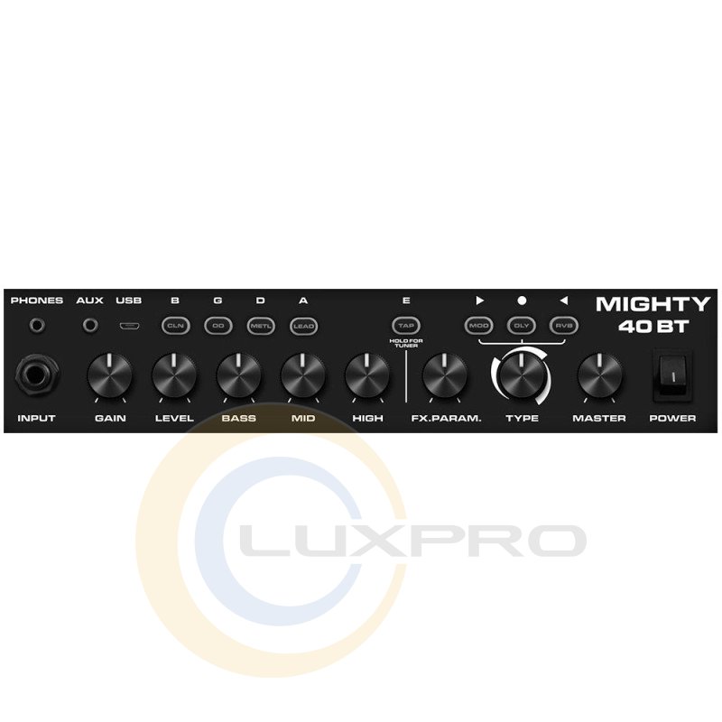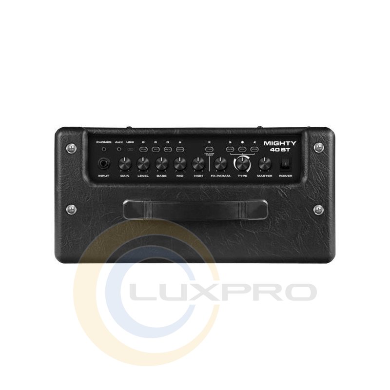 Помимо основного инструментального входа Jack 1/4" на верхней панели имеется выход на наушники (mini-jack 3.5 мм), вход Aux In для подключения внешних источников звука и разъем Micro USB для обновления прошивки. Важно отметить, что комбоусилитель поддерживает беспроводное подключение по Bluetooth, которое позволяет воспроизводить музыку с вашего смартфона, а также управлять практически всеми параметрами Mighty-40BT (включая недоступные на лицевой панели, например шумодав) через специальное приложение Mighty Amp. Для удобной транспортировки сверху предусмотрена ручка.