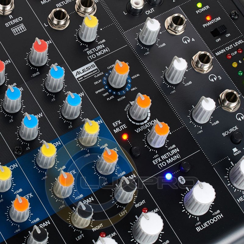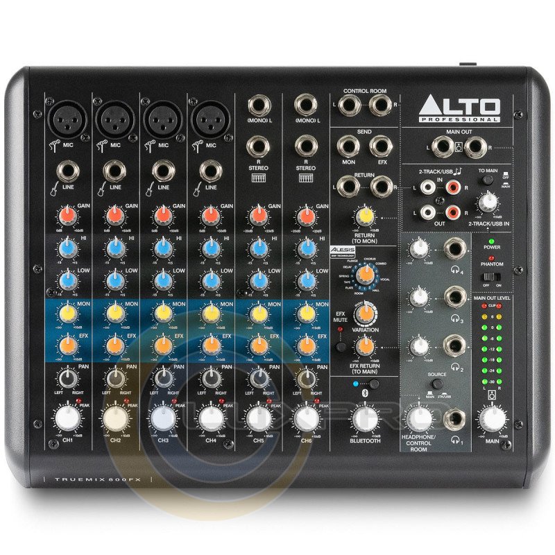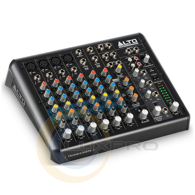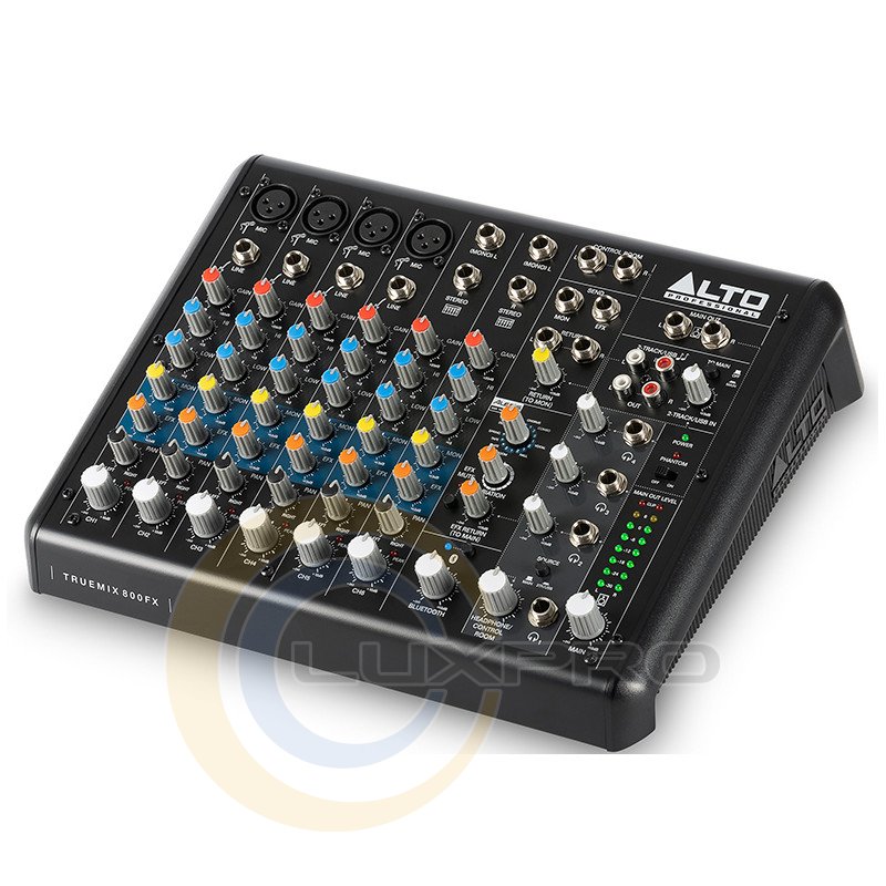 Микшерный пульт TRUEMIX800FX. Уникальная особенность серии TrueMix: канал Bluetooth также поддерживает сопряжение телефонов без обратной связи за счет использования технологии mix-minus. Имеется восемь аналоговых входов с большим запасом мощности для минимизации шума и ограничения сигнала. Четыре микрофонных входных канала оснащены входами XLR, которые отлично подходят для подключения динамических или конденсаторных микрофонов с фантомным питанием 48 В. Эти каналы также имеют симметричные линейные входы ¼ дюйма для подключения инструментов и других сигналов линейного уровня.