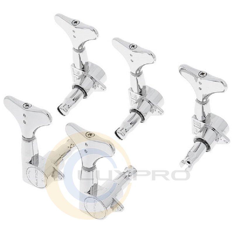Колки для бас-гитары PRB-5230-C0 Bass Ratio 2 + 3 Y Key Chrome. Одно полное вращение приводит к изменению высоты тона на один полный тон (плюс-минус). От Low B до G передаточное число составляет 48:1, 36:1, 30:1, 20:1, 18:1.