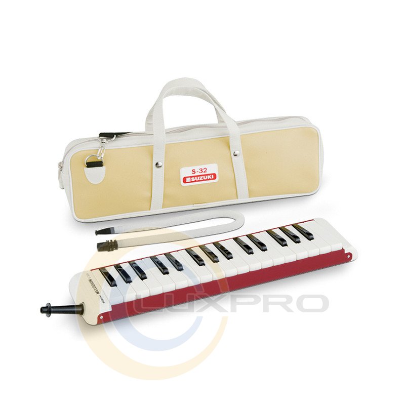 SUZUKI S-32C - мелодика, клавиши: Диапазон: f'-c''''. Металлический корпус. Фосфорные бронзовые язычки. Размеры (Д x Ш x В): 430 мм x 50 мм x 100 мм. Вес: 660 г. Цвет: белый/красный. Включает мягкую сумку, трубку для выдувания и мундштук.
