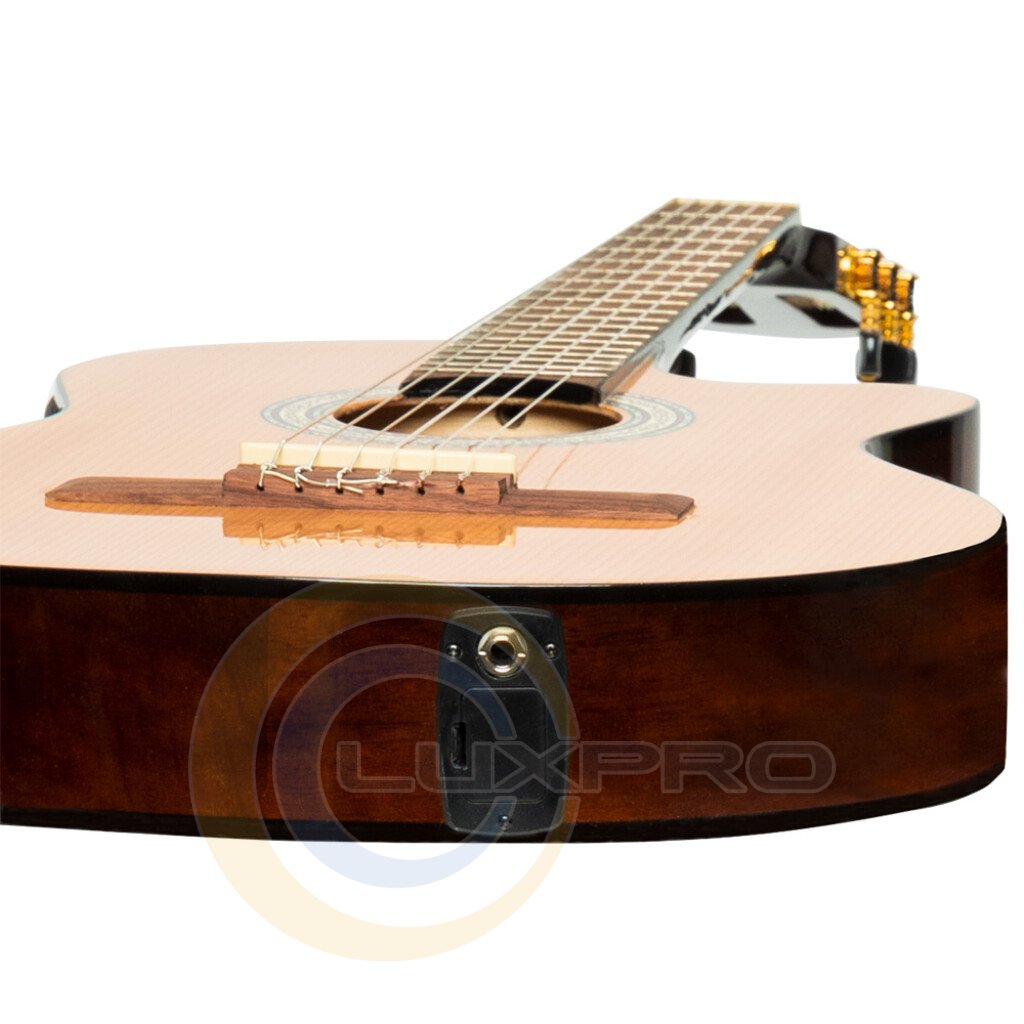 Пьезоподставка под седлом и эквалайзер CL-4 с регуляторами громкости, баса, средних, высоких и присутствия (+/- 12 дБ), встроенный хроматический тюнер, переключатель фазы, индикатор низкого заряда батареи и выходной разъем 6,35 мм ( 1/4") (разработано B-Band) - этого более чем достаточно для прекрасной звуковой симфонии, звучащей из этой гитары. STAGG известен своими надежными инструментами, поэтому вы можете быть уверены в качестве этой гитары. Она легко настраивается и долго держит порядок. Эта электроакустическая гитара с классическим корпусом - отличный выбор для тех, кто хочет приобрести качественный инструмент с великолепным звучанием и стильным дизайном.