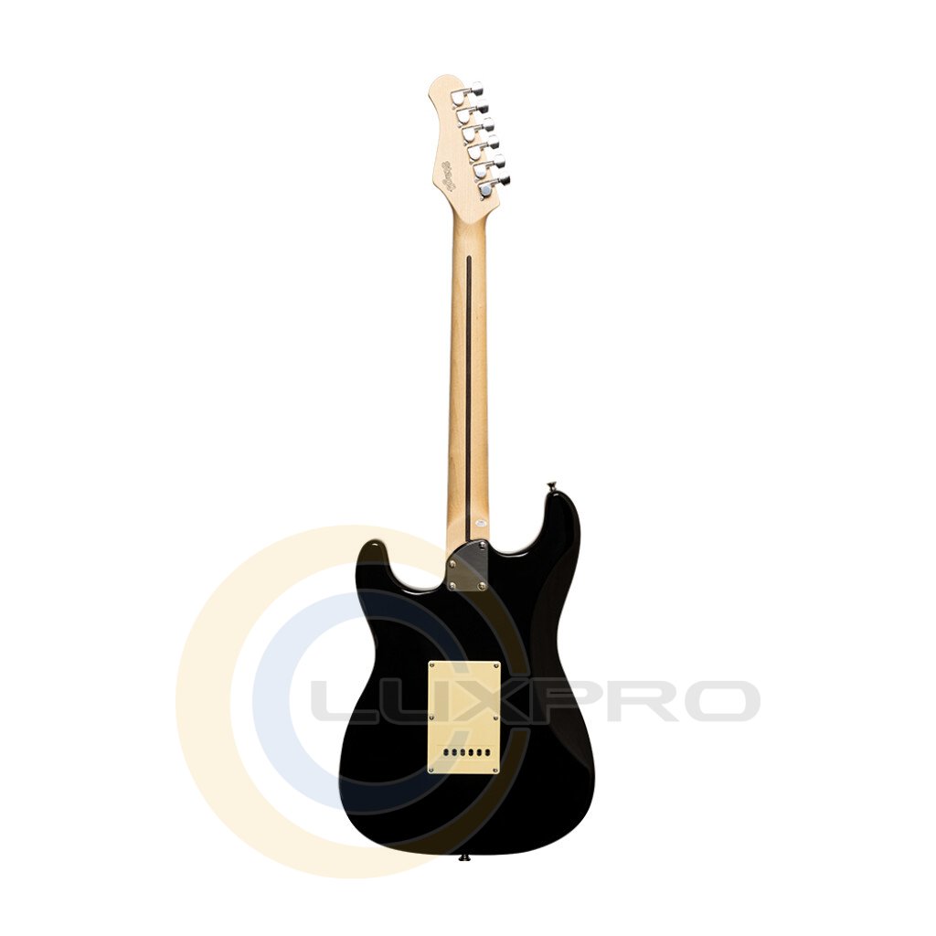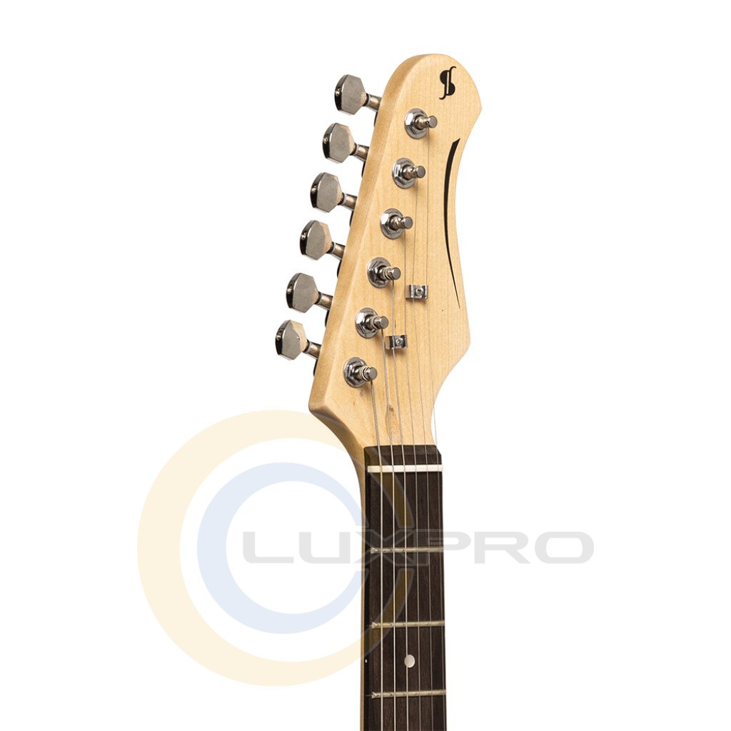 Электрогитара STAGG SES-30 обладает тремя звукоснимателями-синглами, одной ручкой регулировки громкости и двумя – тембра. Есть 5-ти позиционный переключатель звукоснимателей. Бридж вибрато выполнен в S-стиле, колки – никелевые, литые. Верхний порожек – костяной. На гитару установлены струны Корейского производства и пикгард состаренного белого цвета. Мензура – 648 мм.
