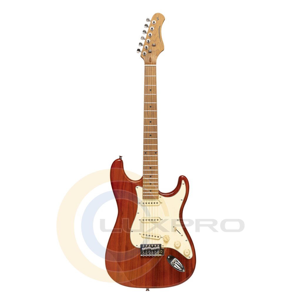 STAGG SES-55 – шестиструнная винтажная электрогитара серии «S» в корпусе типа «стратокастер» в цвете санберст. Корпус инструмента выполнен из массива павловнии. Гриф на болтовом креплении с легким доступом к последним ладам обладает матовой отделкой и сделан из клёна с кленовой накладкой. У гитары 22 лада, маркеры ладов выполнены в виде черных точек.