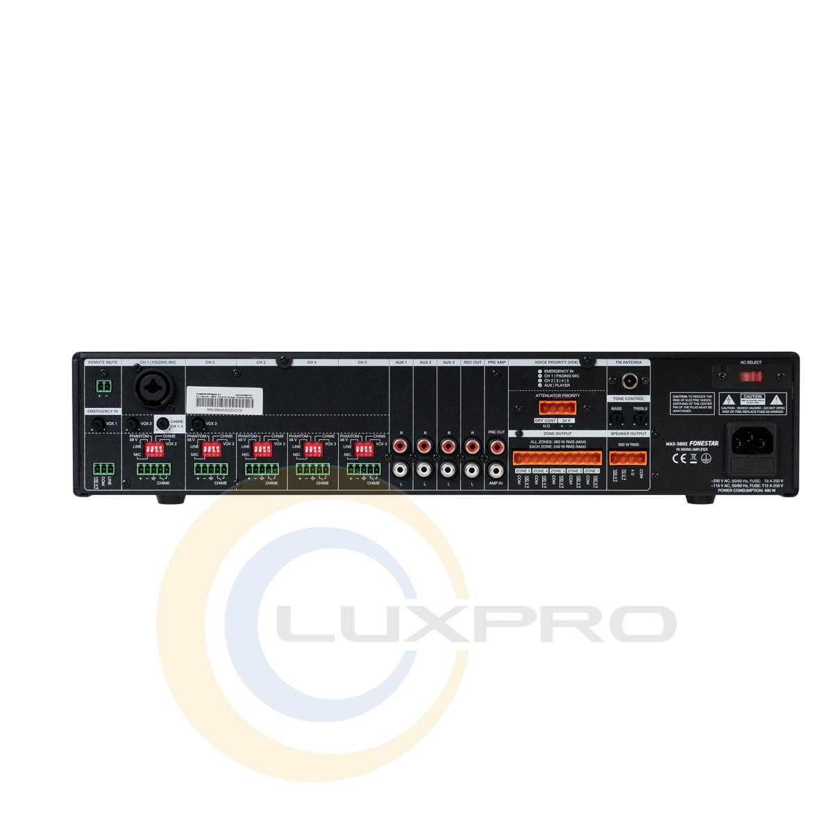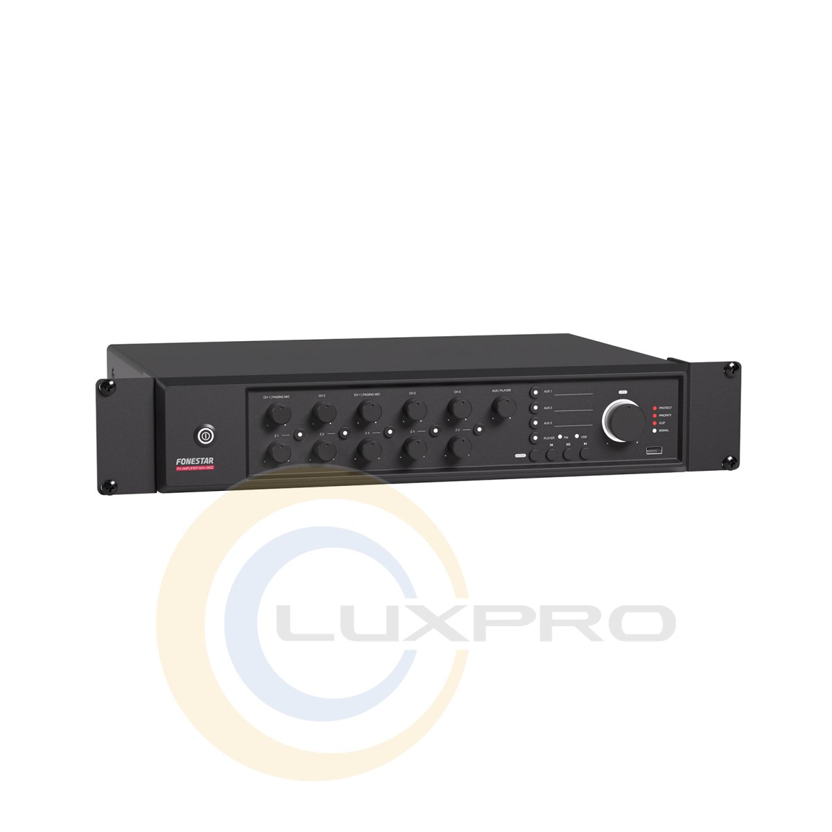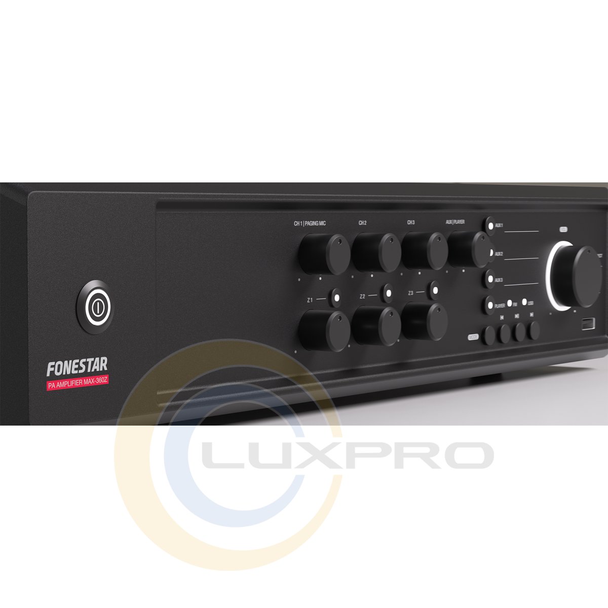MAX-360Z – это разработанный Fonestar, уникальный, стильный и инновационный усилитель мощности класса D для систем оповещения, с селектором зоны и USB/FM-плеером. Устройство отличается высокой производительностью и надежностью, обеспечивает наилучшее качество звука, позволяет на длительный срок добиться качественного покрытия любого пространства. Функция распределения акустических систем на зоны позволяет устанавливать разные уровни громкости для каждой зоны в отдельности.Характеристики: