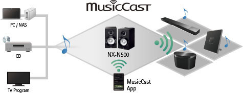 Система MusicCast основана на использовании высокоэффективной беспроводной сети передачи аудиоконтента, по которой цифровые музыкальные файлы со смартфона, ПК или сетевого хранилища можно передавать в потоковом режиме на другие находящиеся в доме устройства категории MusicCast. В системе также предусмотрено совместное использование музыки с такого внешнего устройства, подключенного к NX-N500, как, например, телевизор или BD-проигрыватель. Возможна и потоковая передача аудиоконтента со смартфонов или планшетов, подключенных по технологии Bluetooth, на устройства категории MusicCast в нескольких комнатах.