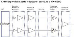 Симметричная схема устраняет внешние помехи, которые подмешиваются к сигналу. Цифровые аудиосигналы в NX-N500 подвергаются преобразованию в левом канале, затем подаются в правый. XLR-кабель обеспечивает симметричное соединение между акустическими системами. Такой подход способствует максимальному устранению шумов.