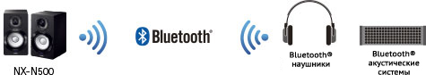 NX-N500 оснащен новейшей технологией Bluetooth, делающей работу в беспроводном режиме удобнее, чем когда-либо прежде. Можно осуществлять потоковую передачу музыки с NX-N500 на Bluetooth-совместимые наушники для индивидуального прослушивания или на Bluetooth-совместимые акустические системы.