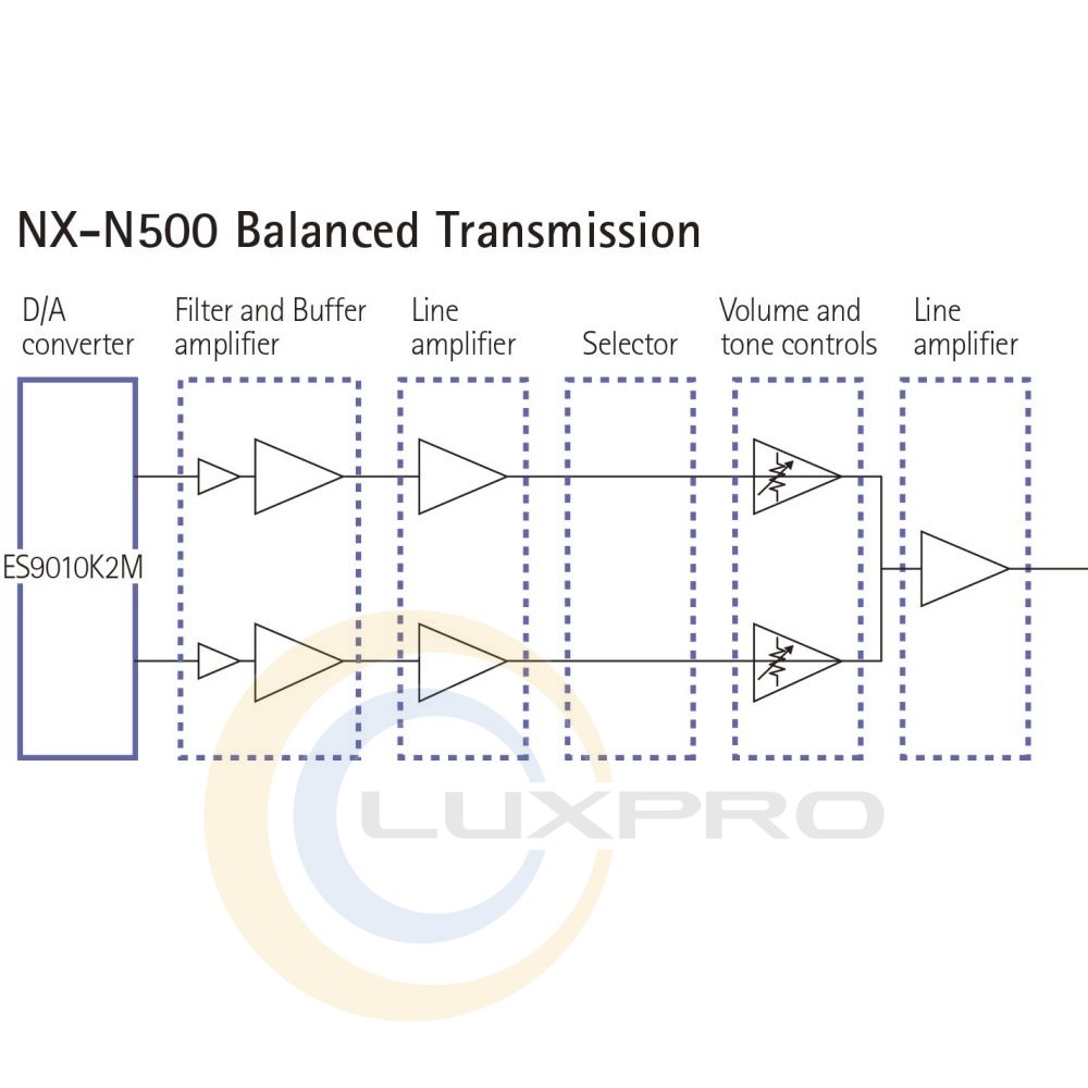 В модели NX-N500 используется Ц/А-преобразователь ES9010K2M компании ESS Technology, Inc., который не только выполняет обработку 32-разрядного аудиосигнала, но и способен обрабатывать большие объемы аудиоданных с поддержкой формата PCM 384 кГц и собственного DSD 5,6 МГц, с мощной отдачей в нижнем регистре и высокой четкостью в верхнем. Поскольку встроенный ЦАП имеет собственный тактовый генератор, имеется и встроенная функция устранения джиттера, что позволяет выполнять преобразование с крайне низким уровнем джиттера.