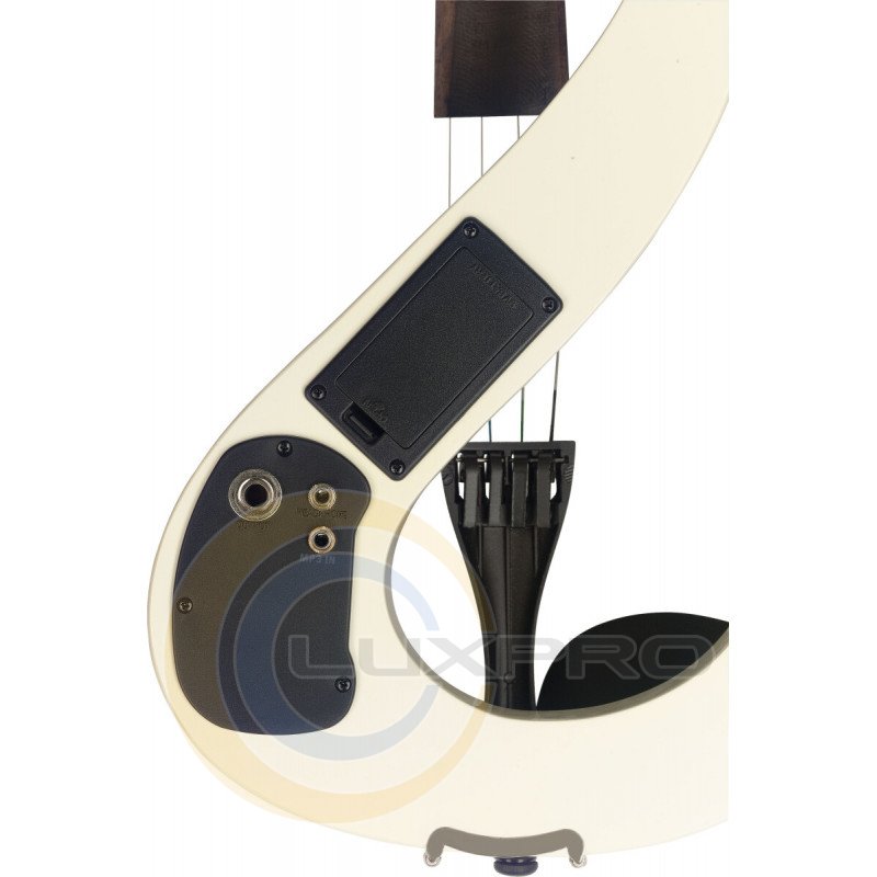 Она имеет следующие спецификации: дека из лакированного клена, 4 подстроечных винта, регулировки громкости, НЧ и ВЧ,выход на наушники: мини-джек, линейный выход: джек, в комплекте: смычок, канифоль, футляр, наушники, цвет: белый.