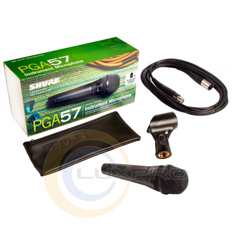 PGA57-XLR - микрофон c выключателем. Микрофон комплектуется кабелем с разьемами XLR-XLR. Инструментальный микрофон PGA57-XLR от компании Shure (США) создан для озвучивания инструментов, комбоусилителей и гитарных усилителей. Кроме этого, микрофон можно использовать на небольших концертных площадках и в project-студиях. Диаграмма направленности микрофона кардиоидная, благодаря чему он прекрасно снимает сигнал, при этом эффективно подавляя посторонние шумы с тыльной стороны капсюля.
