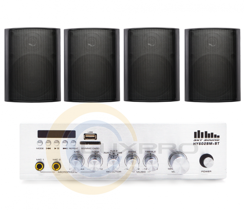 Акустический комплект SKY SOUND WSY-3004 состоит из 4-х настенных колонок Sky Sound NS-30 (белые / черные) и одного усилителя мощности Sky Sound HY-602MB+BT. Комплект системы озвучивания предназначен для небольших помещений, кафе, салонов красоты или офисов и т.д. (до 60 кв.м.).