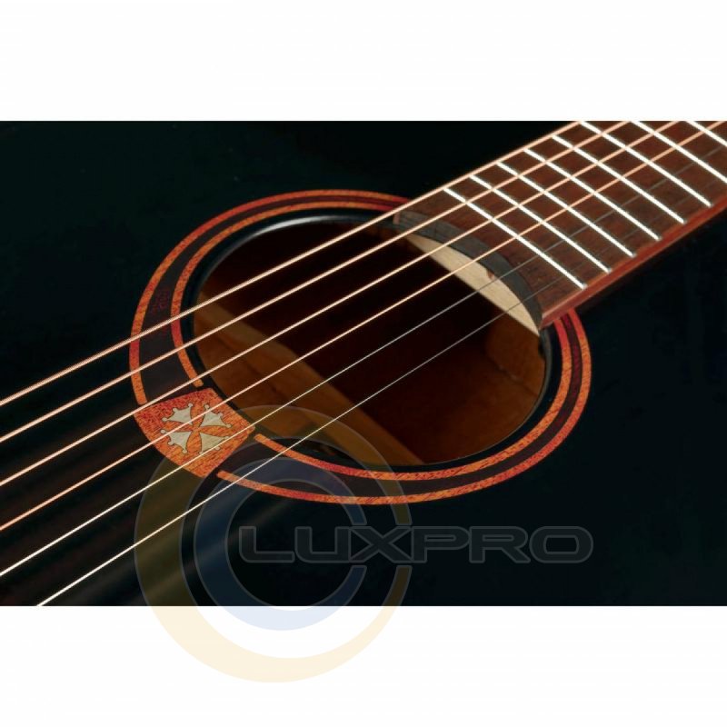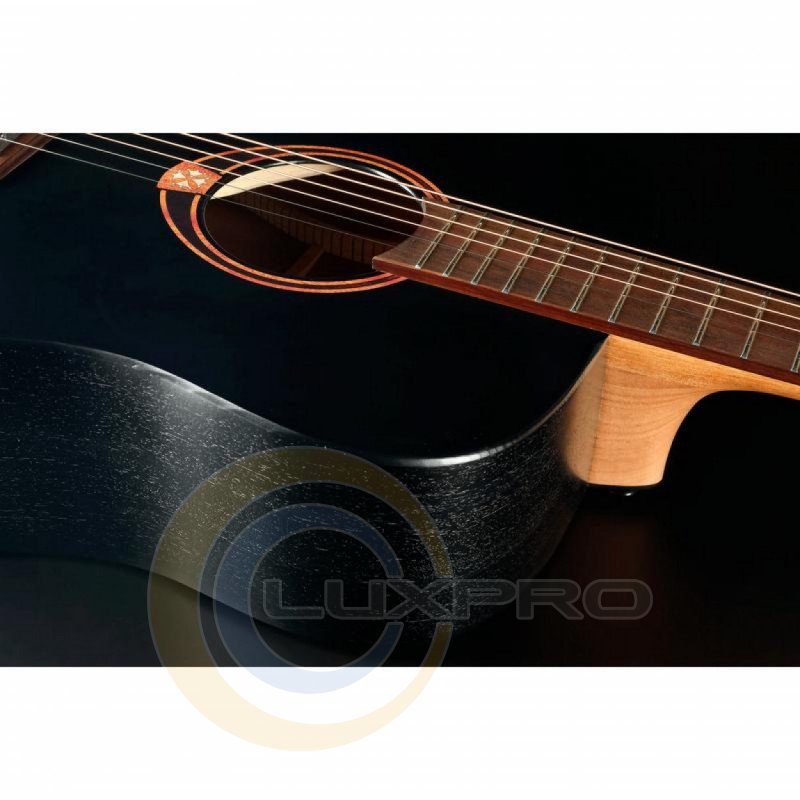 Дизайн этой гитары поражает элегантностью и мастерством. Сплошная верхняя дека выполнена из ели, а обечайки и нижняя дека – из красного дерева. Такая комбинация материалов корпуса в форме дредноут прекрасно дополняет и усиливает звучание металлических струн (Bronze 80/20 Light 12-53), для которых характерен яркий и звонкий звук. Гриф выполнен из красного дерева и имеет накладку из коричневой композитной древесины BrankoWood (искусственная форма полисандра), которая не только удобна для игры, но и дополняет вид гитары, корпус которой покрыт черным сатиновым покрытием.