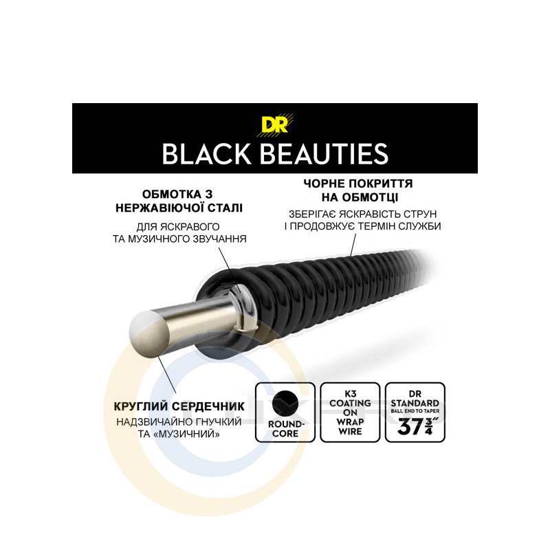 Струны для бас-гитары BKB5-130 серии Black Beauties™ сочетают в себе тональные преимущества круглого сердечника и фирменное защитное покрытие K3 элегантного черного цвета, продлевающее срок службы ваших струн. Круглый сердечник и обмотка из нержавеющей стали обеспечивают насыщенность звучания и сбалансированный гармонический отклик, а также удобство игры, которое является одной из отличительных черт всех струн DR. Жесткое защитное покрытие также добавляет невероятную четкость и артикуляцию каждой ноты, уменьшая нежелательные обертоны.