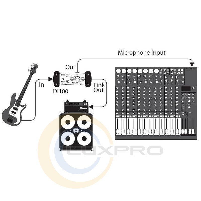 DI100 - директ-бокс. Подключитесь к входам 1/4'' TRS или XLR, а затем направьте звуковой сигнал на вашу консоль через выход XLR. Вы даже можете подключить ваш гитарный или басовый комбоусилитель к директ боксу BEHRINGER DI100, который работает с комбиками мощностью до 3000 Вт, и все так же получать идеальный сигнал.