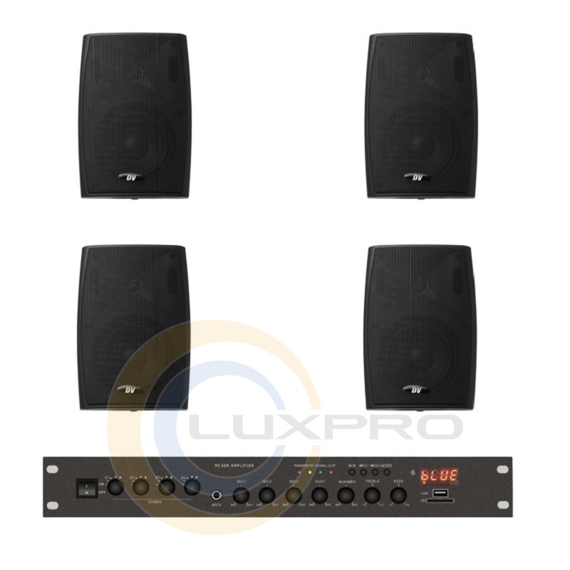 Акустический комплект LA804PB4B для фонового озвучивания помещений, офисов, кафе и открытых площадок средней площадью 120 кв. м. В комплект входит устройство для воспроизведения звука на АС и набор акустических систем. Кабель для подключения акустических систем в комплект не входит.
