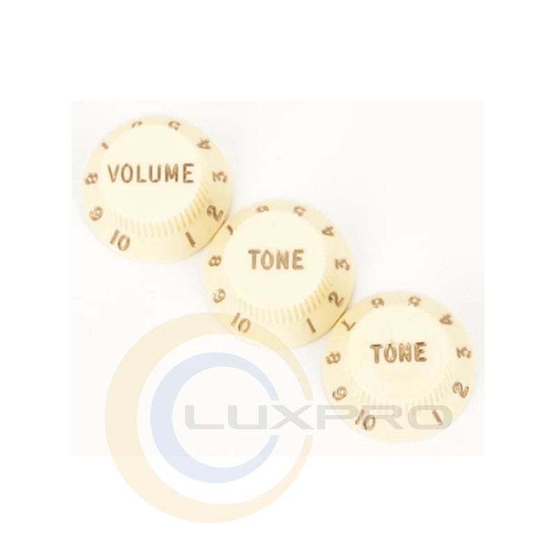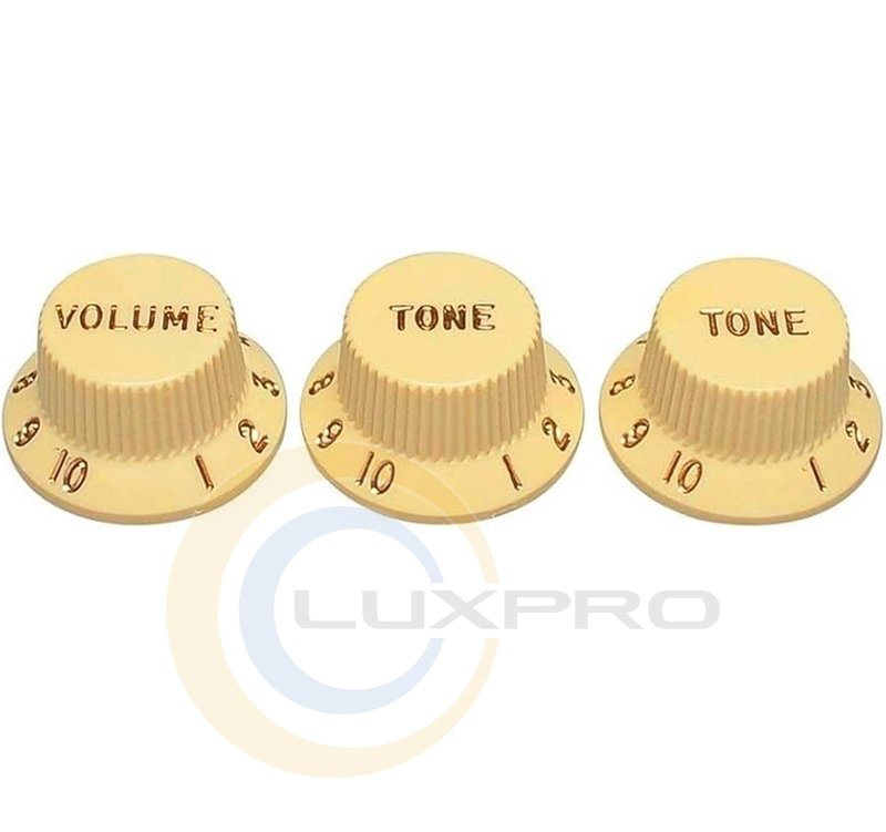 Набор из трех пластиковых ручек управления, предназначенных для потенциометров с раздвоенным валом 1/4" почти на всех моделях Stratocaster американского и мексиканского производства, выпущенных с 1954 года по настоящее время.
