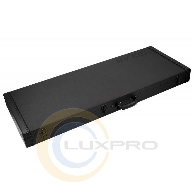 Эта гитара доступна в матовом черном цвете и поставляется вместе с жестким деревянным кейсом Solar.