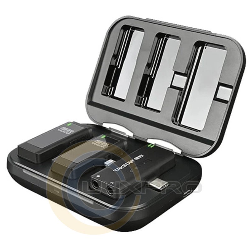 До 10 часов непрерывного воспроизведения при подключении к камере через интерфейс 3,5 мм. Включает зарядный кейс для хранения и зарядки передатчиков и приемника. Перезаряжаемый аккумулятор емкостью 2000 мАч внутри чехла для зарядки идеально подходит для прямых трансляций/интервью на открытом воздухе.