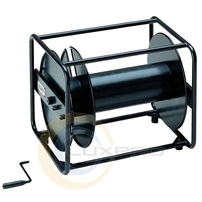 Прочная металлическая катушка для кабеля с лакокрасочным покрытием, съемная рукоятка, регулируемый фрикционный тормоз, разделительный фланец для фиксации громоздких концевых соединителей кабеля в отдельных отсеках.
