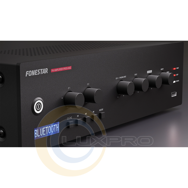 PROX-60Z - трансляционный усилитель предназначен для систем оповещения и фонового озвучивания, и может работать как с трансляционными, так и с низкоомными акустическими системами. Предлагает удобное управление и современный, сдержанный дизайн; выходы на 2 зоны с регулируемым уровнем громкости для каждой из них; универсальный Bluetooth / USB / FM-проигрыватель для воспроизведения фоновой музыки; безопасные и долговечные разъемы Euroblock, требующие минимального обслуживания. Компактный размер прибора подходит как для настольного использования, так и монтажа в рековую стойку. PROX-60Z является решением, которое подойдет для любого бюджета.