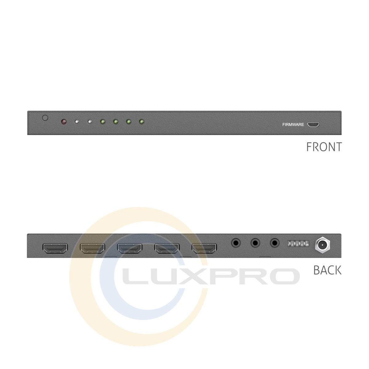 - 4 переключаемых входа HDMI-A на 1 выход HDMI-A, включая деэмбедирование звука (стерео 3,5 мм);