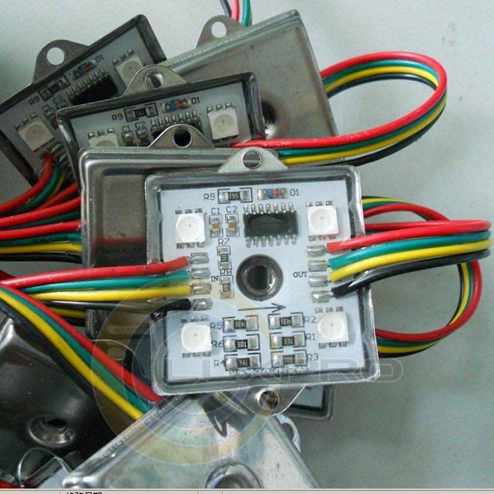 Каждый RGB LED пиксель имеет встроенный драйвер (IC WS2801), который позволяет получить 16млн. различных цветов (8 бит на цвет, 24бит на пиксель). Встроенная микросхема дает возможность автоматической адресации пикселя в гирлянде.Применяются для создания анимированных (динамических) вывесок, лайтбоксов, панелей, логотипов, выставочных стендов и других динамических светодиодных акцентов.В отличии от пикселей WL-12V6RGB2801R обладает "точечным" свечением в два раза ярче чем пиксель WL-12V3RGB2801R, и рекомендуется применять для небольших объемных букв, и местах где необходимо высокая яркость RGB источника.Каждый пиксель управляется отдельно, это дает возможность создать разнообразные видео-эффекты. Соответственно, чем больше пикселей в проекте и чем меньше между ними расстояние, тем более четкие и яркие эффекты можно получить. Автономная система обычно состоит из пикселей, контроллера управления и блока(ов) питания.Данные пиксели устанавливаются на плоскости и крепятся через уши. Минимальный шаг установки пикселей 52мм, максимальный 105мм (без удлинения). Пиксели поставляются в виде гирлянд по 20шт.Простая система состоит из:- необходимого количества пикселей;