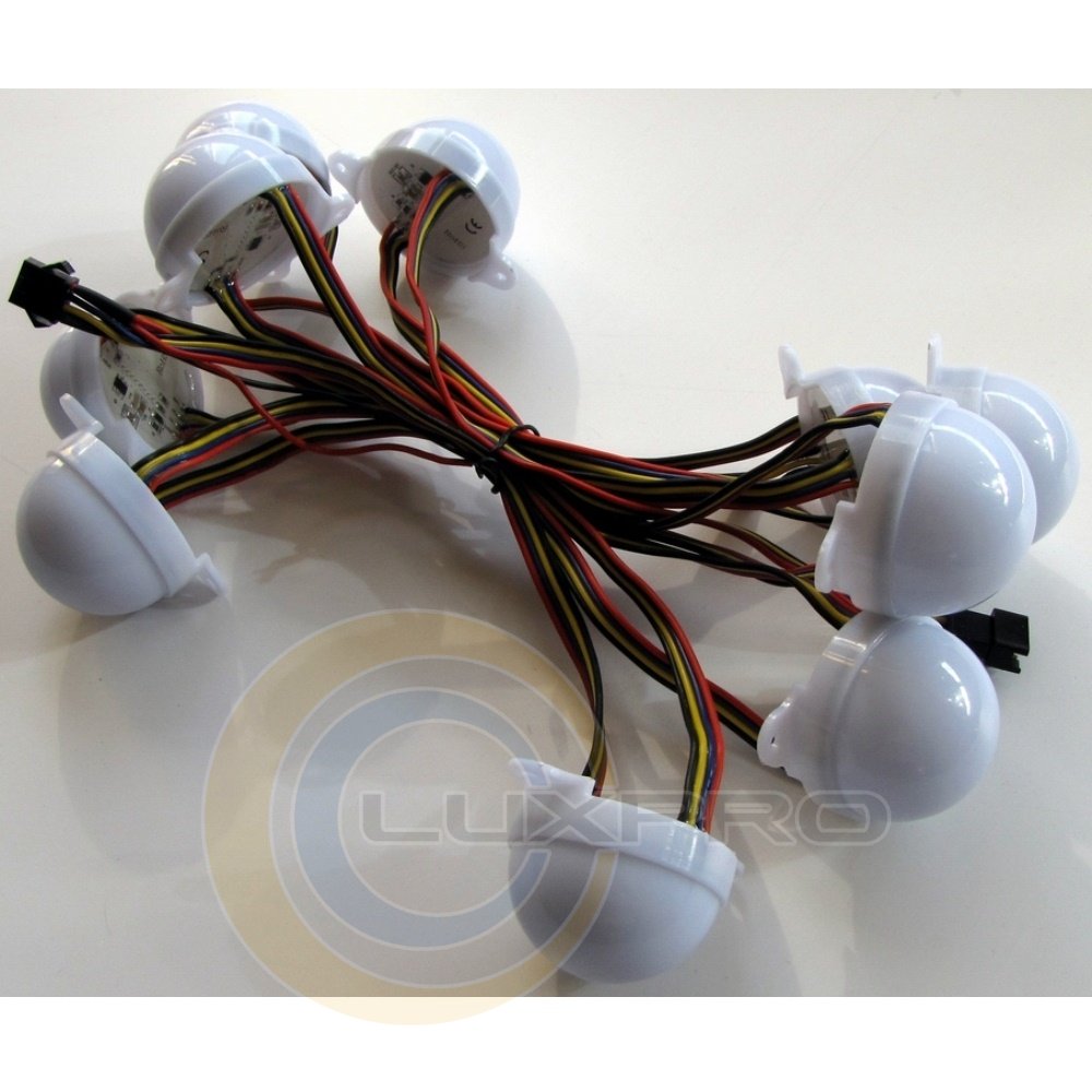 Каждый RGB LED пиксель имеет встроенную микросхему – pixel driver (IC WS2801), который позволяет получить 16 млн. различных цветов (8 бит на цвет, 24 bit на pixel). Применяются для создания анимированных фасадов, логотипов, выставочных стендов и других динамических светодиодных акцентов.Каждый пиксель управляется отдельно, это дает возможность создать разнообразные видео-эффекты. Соответственно, чем больше пикселей в проекте и чем меньше между ними расстояние, тем более четкие и яркие эффекты можно получить.Система обычно состоит из пикселей, контроллера управления и блока питания. Данные пиксели устанавливаются на плоскости и крепится через уши или в отверстие Ø45 мм. Минимальный шаг установки пикселей 60мм, максимальный 200мм (без удлинения). Пиксели поставляются в виде гирлянд по 20шт.При установке на улице (outdoor) необходима дополнительная защита от ультрафиолетового излучения (UF). Обычно применяются специальные лаки и другие средства защиты от UF излучения.Простая система состоит из:- необходимого количества пикселей;