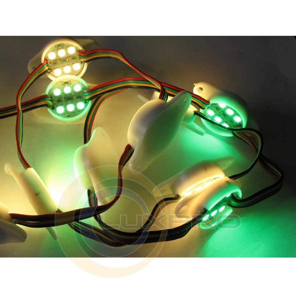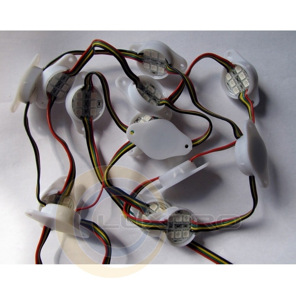Каждый RGB LED пиксель имеет встроенный драйвер (IC WS2801), который позволяет получить 16млн. различных цветов (8 бит на цвет, 24бит на пиксель). Встроенная микросхема дает возможность автоматической адресации пикселя в гирлянде.Применяются для создания анимированных (динамических) вывесок, лайтбоксов, панелей, логотипов, выставочных стендов и других динамических светодиодных акцентов. В отличии от пикселей WL-12V6RGB2801R обладает "точечным" свечением в два раза ярче чем пиксель WL-12V3RGB2801R, и рекомендуется применять для небольших объемных букв, и местах где необходимо высокая яркость RGB источника.Каждый пиксель управляется отдельно, это дает возможность создать разнообразные видео-эффекты. Соответственно, чем больше пикселей в проекте и чем меньше между ними расстояние, тем более четкие и яркие эффекты можно получить. Автономная система обычно состоит из пикселей, контроллера управления и блока(ов) питания.Данные пиксели устанавливаются на плоскости и крепятся через уши. Минимальный шаг установки пикселей 52мм, максимальный 105мм (без удлинения). Пиксели поставляются в виде гирлянд по 20шт.Простая система состоит из:- необходимого количества пикселей;
