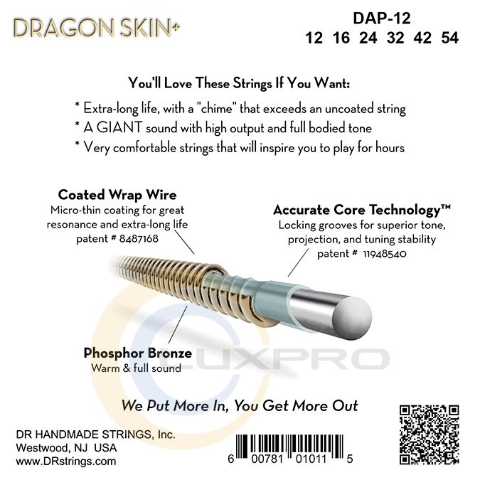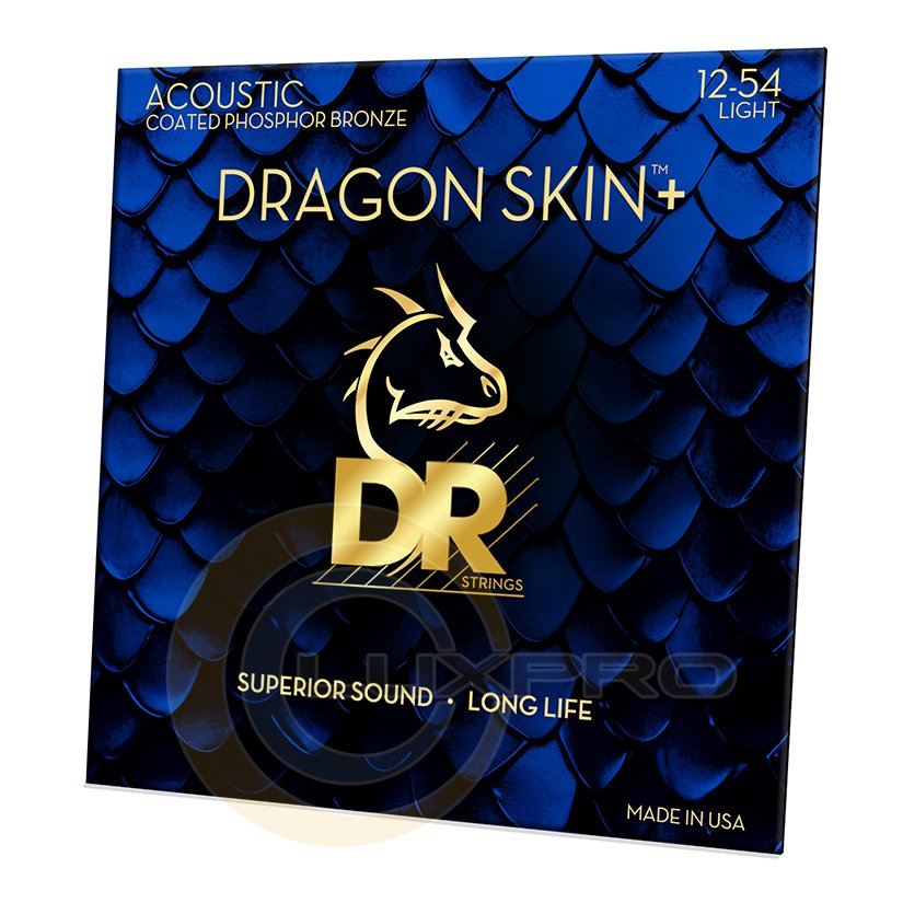 DRAGON SKIN+ Acoustic Phosphor Bronze - Light (12-54) — струны. У Dragon Skin+ модернизированы как сердечник, так и обмотка, чтобы они были исключительно музыкальными, сбалансированными и громкими. Технология Accurate Core Technology™ создает канавки на сердечнике, чтобы удерживать обмотку, позволяя струнам звучать в полную силу.