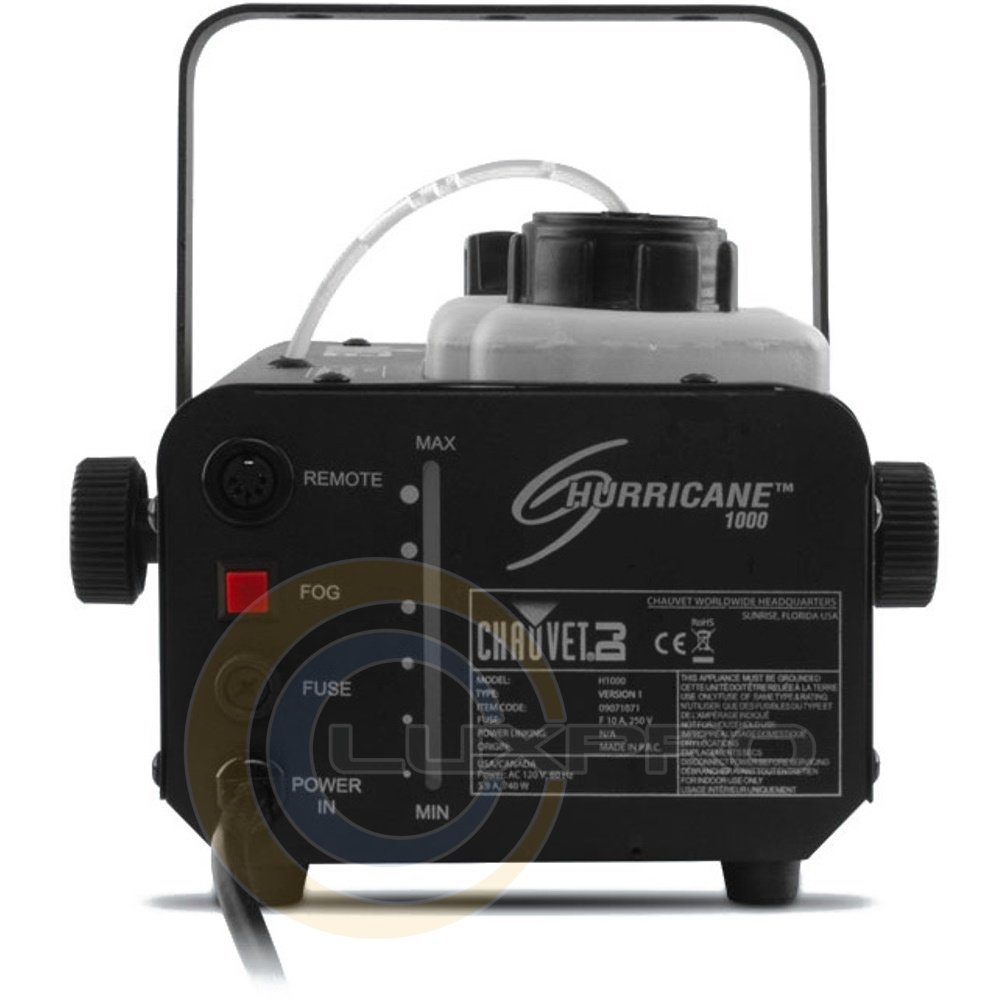 Дым машины серии Hurricane™ обеспечивают надежность и производительность которыми славится CHAUVETHurricane 1000 - это легкая и компактная дым-машина, сочетающая портативность и высокую мощность. Вы можете управлять ей дистанционно, используя комплектные проводной или беспроводной контроллеры. Функция принудительного срабатывания (кнопка Fog) позволяет оперативно реагировать на происходящее на сцене, а бачок с LED подсветкой позволяет легко контролировать остаток жидкости и статус нагревателя. Hurricane 1000 отличается малым временем прогрева, значительно сокращая срок подготовки к использованию.Характеристики: