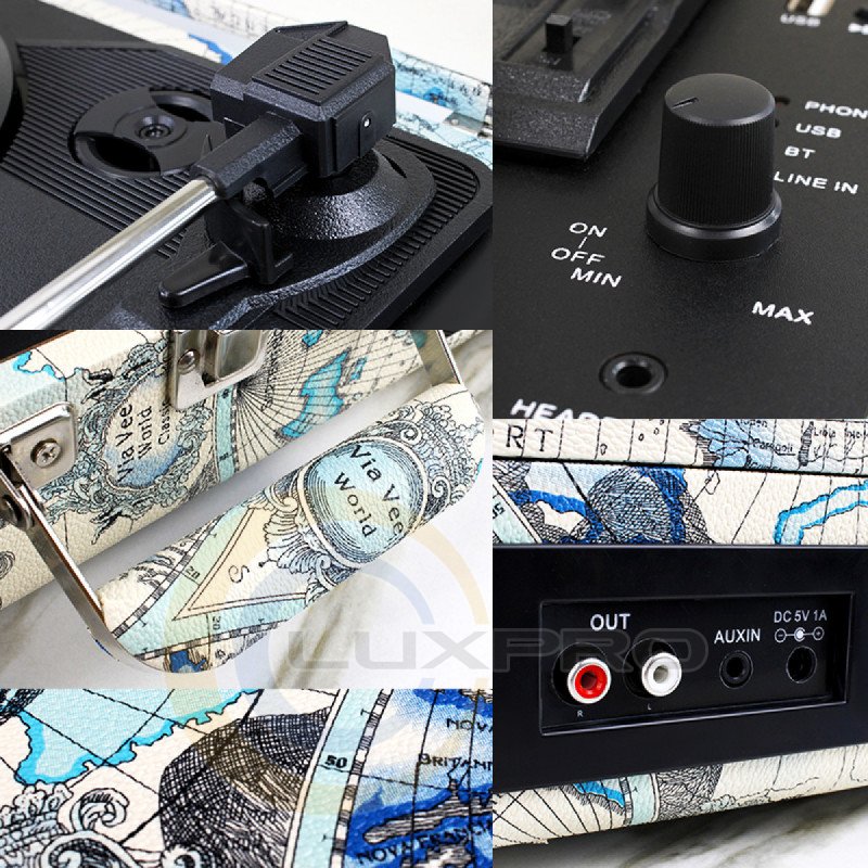 Проигрыватель WLR _Walker (Map) оборудован USB-портом, функцией Bluetooth и разъемами RCA, AUX и Jack 1/8" (3,5 мм) для наушников, что придает ему универсальности. 2 динамика (стерео 2.0) и пьезоэлектрический керамический картридж обеспечивают качественное звучание, а функция автостопа и светодиодные индикаторы делают пользование максимально комфортным.