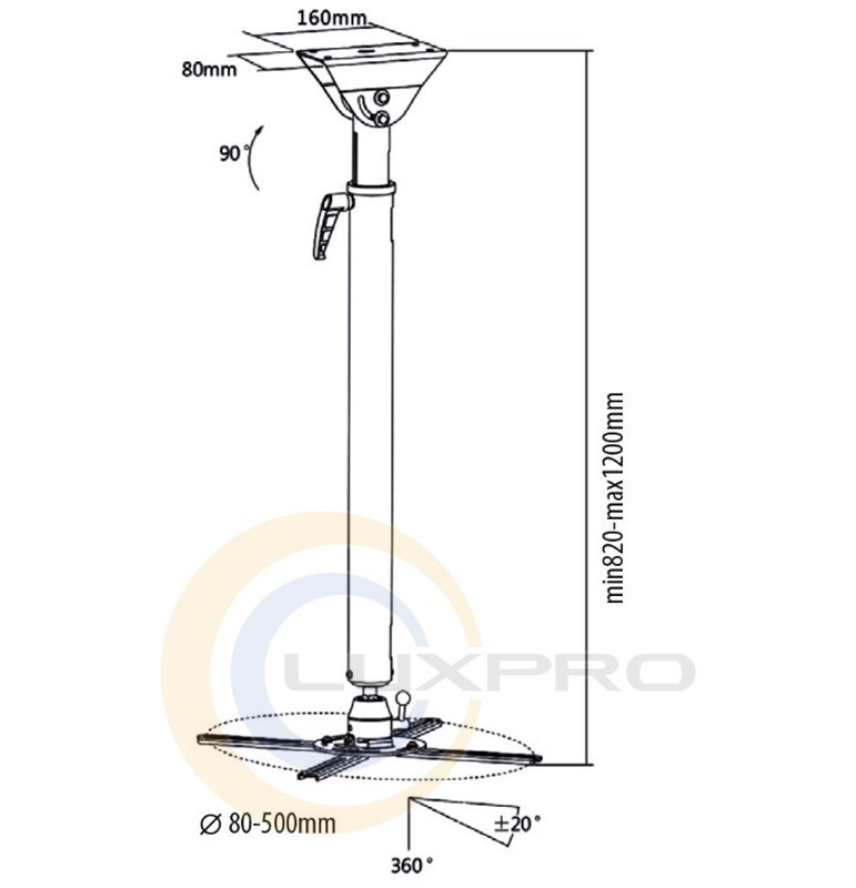 Кронштейн подходит для проекторов массой до 35 кг и имеет универсальный шаблон крепления шириной до 500 мм. Он также обеспечивает возможность наклона и поворота проектора на угол от -20 до +20 градусов и 360 градусов соответственно. Кронштейн выполнен в белом цвете.