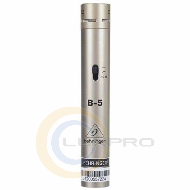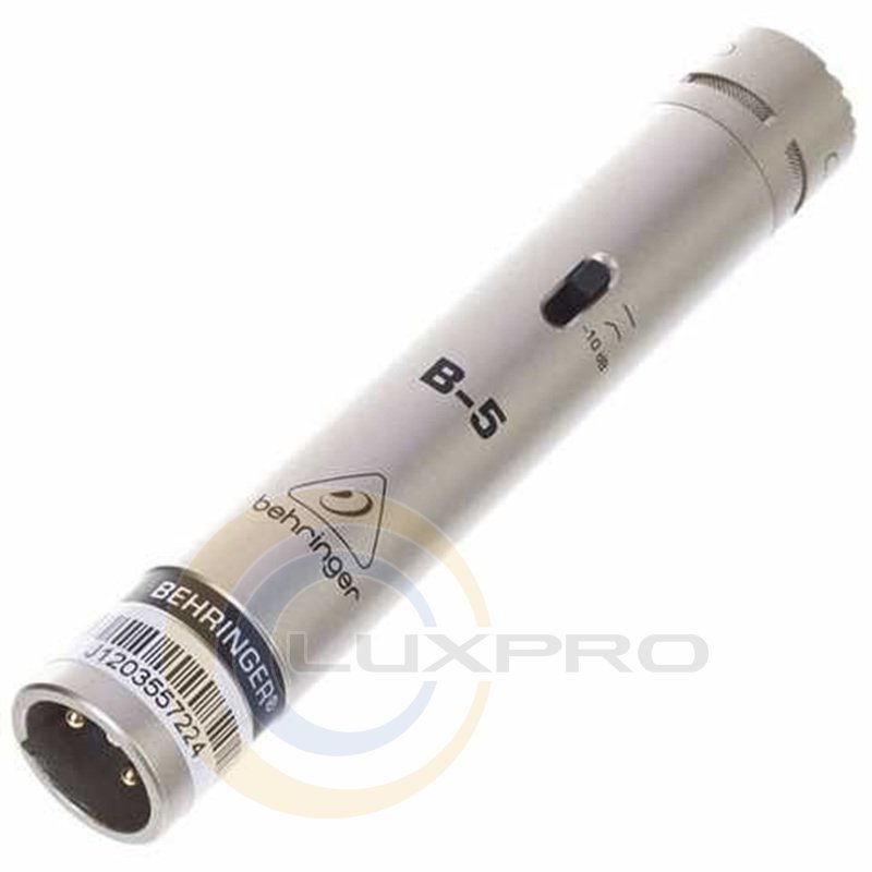Микрофон B5. Сверхмалошумящая бестрансформаторная FET-схема входного каскада устраняет низкочастотные искажения. Благодаря аттенюатору (-10 дБ) микрофон можт работать с источниками сигналов большой громкости, в то время как отключаемый обрезной НЧ фильтр позволяет удалить механические шумы. В комплект с Behringer B5 входит жесткий кейс, адаптер для микрофонной стойки и ветрозащитный колпачок.