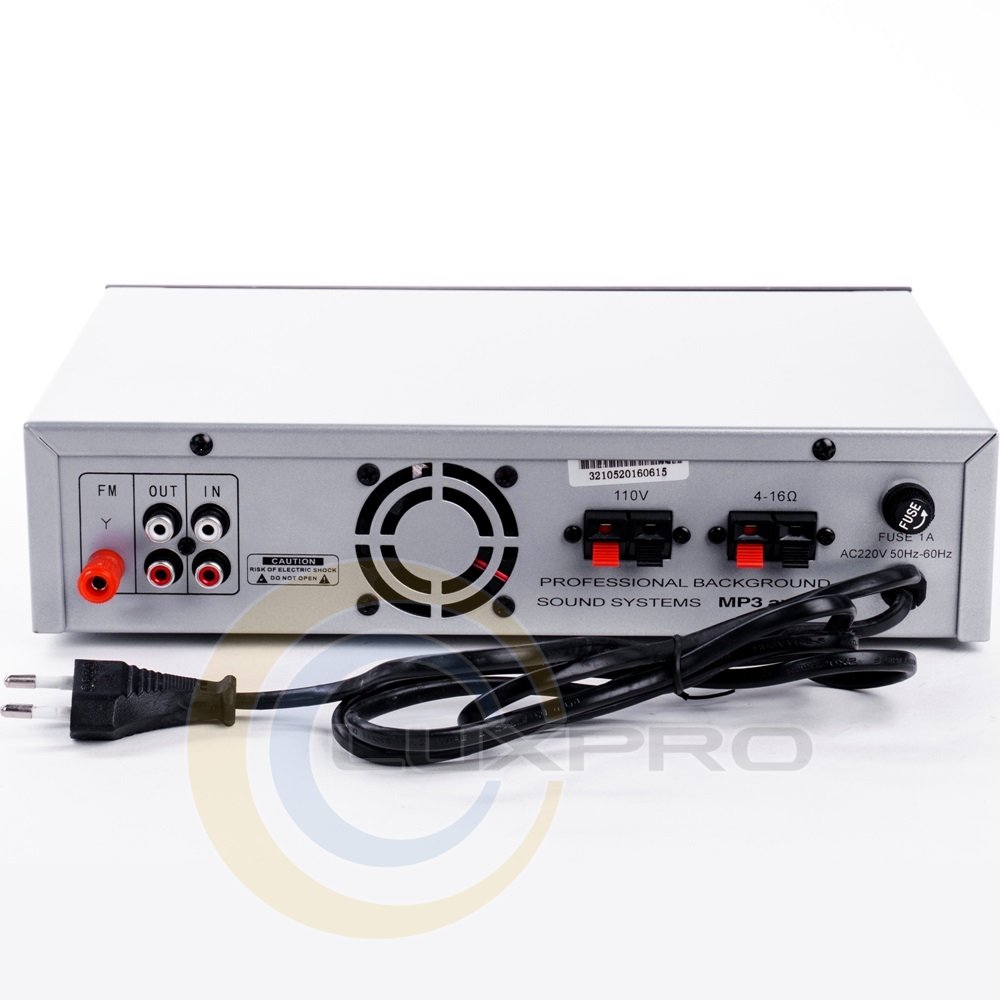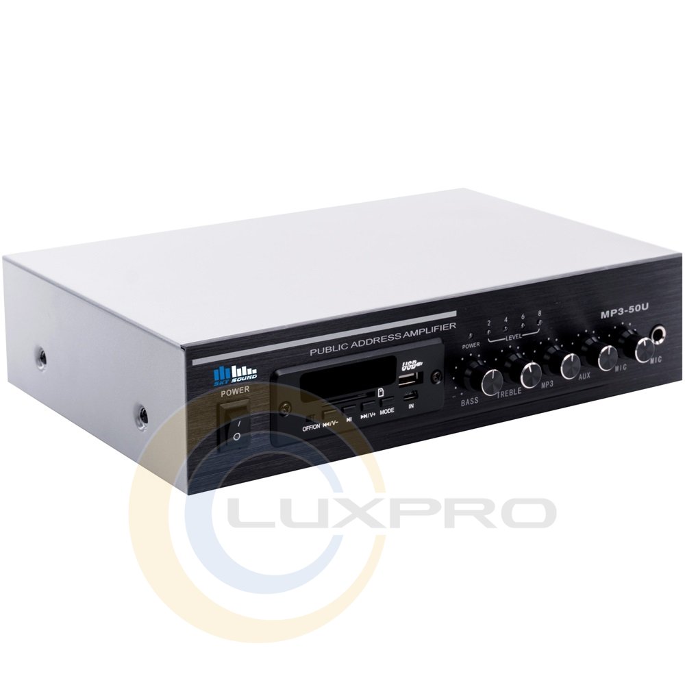 Трансляционный усилитель мощности Sky Sound MP3 50U предназначен для трансляции музыкальных программ и речевых сообщений самостоятельно на базе соответствующего оборудования или в составе системы оповещения.На передней панели размещен пиковый индикатор уровня выходного сигнала.Усилитель имеет 1 микрофонный и 2(1) линейных входа с возможностью микширования. Линейные входы предусматривают подключение к ним стерео сигнала. Линейный выход стерео для подключения дополнительного усилителя или другого оборудования.Двухполосные регуляторы тембра для низких и высоких частот обеспечивают настройку частоты звука в полосе 40 Гц - 18 кГц.Один из выходов усилителя Sky Sound MP3 50U оборудован повышающим напряжение трансформатором для уменьшения потерь аудио сигнала в линии громкоговорителей и предусматривают подключение линии трансляции напряжением 100В/70В, а второй выход для подключения обычных "низкоомных" 4-16 Ом акустических систем.В усилитель встроен собственный источник звукового сигнала. FM-тюнер для трансляции радиостанций FM-диапазона и аудио декодер, позволяющий воспроизводить звуковые файлы форматов MP3 и WMA с карт памяти USB/SD/MMC, подключаемых к установленному в усилитель картридеру.Питание уcилителя Sky Sound MP3 50U осуществляется от сети переменного тока 220В/50Гц.Производитель (Южная Корея).Характеристики: