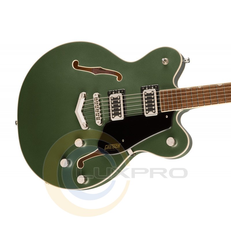 G5622 ELECTROMATIC CENTER BLOCK DOUBLE-CUT WITH V-STOPTAIL OLIVE METALLIC - гитара оснащена двумя хамбакерами Black Top Broad'Tron, обеспечивающими богатый звук с мощными низкими частотами, выразительной серединой и яркими верхами. Благодаря этим звукоснимателям и продуманной системе управления (три регулятора громкости, один тон и 3-позиционный переключатель), инструмент предлагает удивительную гибкость для различных музыкальных жанров.