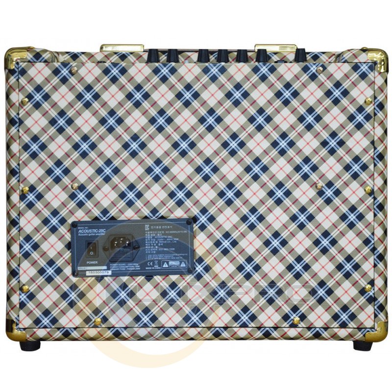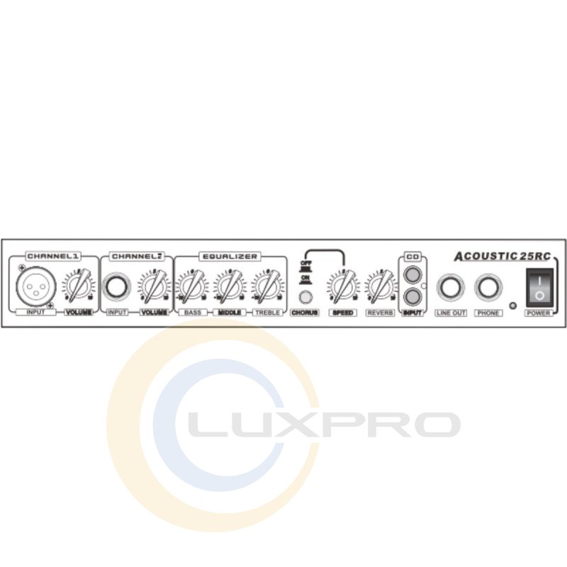 Acoustic25RC - гитарный комбоусилитель оснащен двумя каналами: первый канал имеет вход XLR для подключения микрофона, а второй канал поддерживает подключение через TRS 1/4". Для подключения дополнительных источников сигнала предусмотрен RCA вход.
