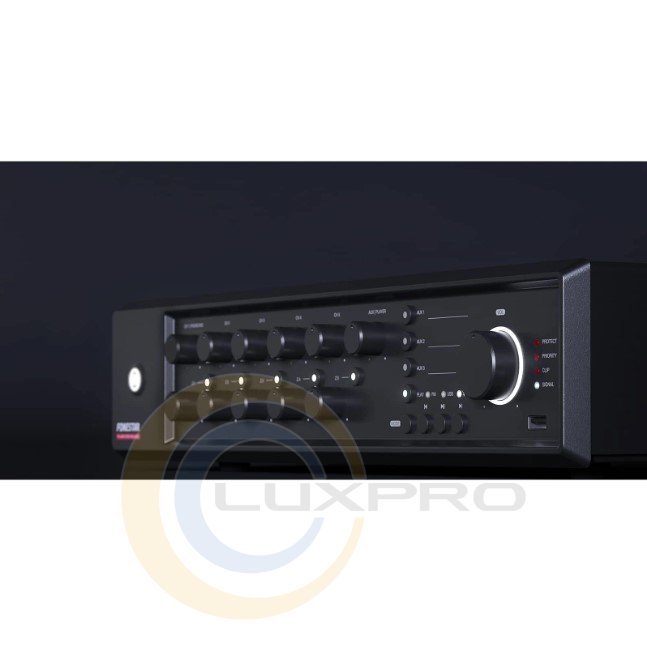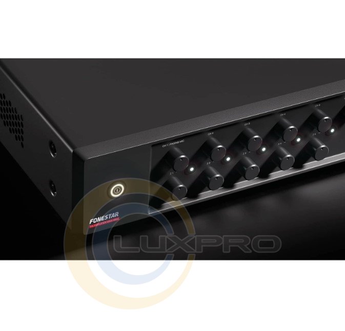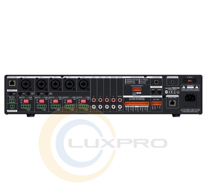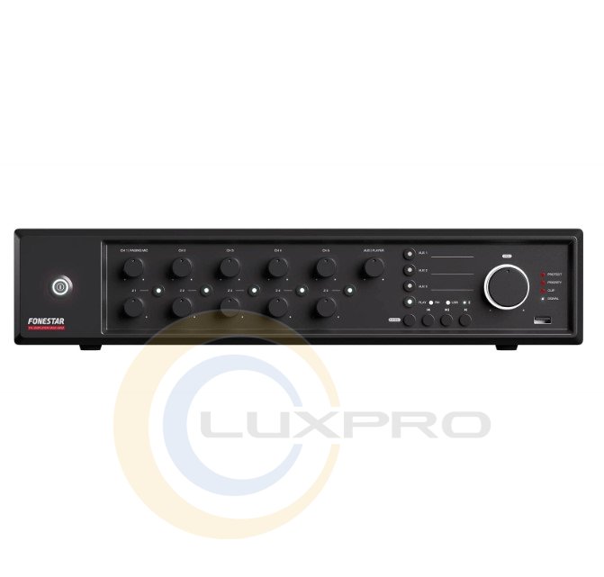 - усилитель класса D для систем оповещения и источник питания с импульсным стабилизатором напряжения (SMPS);- Bluetooth/USB/FM-проигрыватель;- система зональных микрофонных входов ZONEMIC-6 от Fonestar;- вход для подключения панели дистанционного управления;- микрофонный вход с управлением сводкой, усилением и уровнем приоритета;- генератор мелодий (Chime);- 3 x aux-входы;- Emergency-вход и отключение звука для подключения к системам сигнализации и эвакуации;- приоритет аттенюатора 24 В;- 3-й ведущий выход (100 В) с приоритетом аттенюатора;- регуляторы тембра;- выходы на линии 100 В, 70 В и 4 Ом;- 5 выходных зон с регулировкой уровня громкости и отключением звука;◦ Мощность: 480 Вт RMS;◦ Частотный диапазон: 45 Гц – 22 кГц (-10 дБ);◦ Коэффициент нелинейных искажений + шум (THD+N): <0.5% при 1 кГц;◦ Соотношение сигнал/шум:- микрофонный вход: >75 дБ;- линейный вход: >83 дБ;- Aux-вход: >81 дБ;◦ Предохранительная система:- ограничение пускового тока (плавный пуск);- защита от сверхтока;- защита от перегрузки;- защита от перегрева;- защита от короткого замыкания;◦ Входные разъемы:- система зональных микрофонных входов ZONEMIC-6 от Fonestar, RJ45, длина кабеля до 200 м;- панель дистанционного управления, RJ45, 250 мВ RMS;- Канал 1, 2, 3, 4 и 5:▴ Микрофонный/линейный балансный вход с фантомным питанием 48 В;▴ Комбинированный разъем (XLR + 6.3 мм) и Euroblock;▴ Воспроизведение рингтонов путем замыкания контактов;- уровень микрофонного сигнала: 5.6 мВ RMS (-45 дБВ)/600 Ом;- уровень линейного сигнала: 250 мВ RMS (-12 дБВ)/100 кОм;- 3 x aux-входы:▴ 2 x разъема RCA;▴ Уровень сигнала 316 мВ RMS (-10 дБВ) / 47.000 Ом;- 1 x Emergency-вход:▴ Разъем Euroblock;▴ Уровень сигнала: линейный 326 мВ RMS (-10 дБВ) или линейный 100 В;▴ Выключение звука (приоритет сигнала системы экстренного оповещения) путем замыкания контактов, разъем Euroblock;- 1 x вход усилителя:▴ Разъем RCA;▴ Уровень сигнала 1.2 RMS (+ 1.5 дБВ);◦ Выходные разъемы:- 1 x Rec:▴ 2 x разъем RCA;▴ Уровень сигнала 316 мВ RMS (-10 дБВ), премастер;- 1 x Pre-out:▴ Разъем RCA;▴ Уровень сигнала 1.2 мВ RMS (+1.5 дБВ);- выход на акустические системы на линии 100 В, 70 В или 4 Ом или на 5 зон акустических систем на линии 100 В с 7-позиционным селектором уровня громкости и функцией отключения звука (макс. 240 Вт на зону), разъем Euroblock;- 1 x Приоритет аттенюатора, 24 В 100 мА и замыкание контактов, разъем Euroblock;- 1 x 3-й приоритетный провод для аттенюаторов (100 В);◦ Импеданс: линия 4 Ω, 100 В (20 Ω) и 70 В (10 Ω), Euroblock;◦ Функционал:- приоритет входов (в порядке уменьшения):▴ Emergency-вход на линии 100 с настраиваемым уровнем сигнала (VOX);▴ Выключение звука путем замыкания контактов;▴ Система зональных микрофонных входов ZONEMIC-6 от Fonestar;▴ Панель дистанционного управления;▴ Канал 1 с выбранным уровнем сигнала (VOX);▴ Каналы 2 | 3 | 4 | 5 с общим выбранным уровнем сигнала CH 2-3-4-5 (VOX);▴ Aux-входы | проигрыватель;- кольцевой LED-индикатор вокруг регулятора громкости, LED-индикаторы aux-входов, зон и проигрывателя;- светодиодные индикаторы питания, сигнала, клипинга, активации приоритета и предохранительной системы;- бескулерное индукционное охлаждение: бесшумное и не требующее обслуживания;◦ Проигрыватель:- Bluetooth/USB/FM-проигрыватель для воспроизведения фоновой музыки;- Bluetooth 5.3;- Автовоспроизведение: автоматически запускает воспроизведение при включении;- Память последнего выбранного режима- память режима воспроизведения (случайный, повтор);◦ Управления:- регулятор уровня громкости микрофонного сигнала;- регулятор уровня громкости мастер-канала;- селек