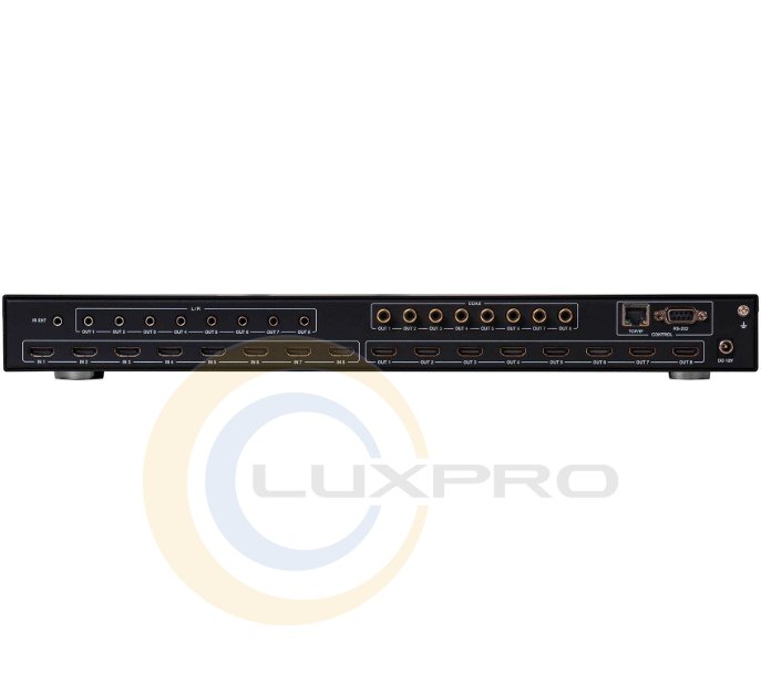 - HDMI матрица 8 x 8;- разрешение: UHD 4K при 60 Гц, YUV 4:4:4;- пропускная способность 18 Гбит/с;- функция DOWN-SCALING для преобразования разрешения 4K в Full HD 1080p;- коаксиальный цифровой аудиоэкстрактор и стереоаналоговый аудиоэкстрактор для каждого выхода;- совместимость с HDR10, HDR10+, Dolby Vision, HLG, ARC, CEC и интеллектуальным управлением EDID;- расширитель дистанционного управления;- ЖК-дисплей с информацией о распределении;- кнопки выбора каналов на передней панели;- дистанционное управление по инфракрасному протоколу дистанционного управления;- веб-интерфейс (Web GUI) через Ethernet;- протокол связи RS-232;- HDMI: 2.0b;- HDCP: 2.3, совместимость с 1.4;◦ Входные разъемы:- 8 x входных разъемов HDMI;- 1 x порт RS-232: DB9;- 1 x Ethernet: RJ-45;◦ Выходные разъемы:- 8 x выходных разъемов HDMI (длина кабеля зависит от разрешения, а именно 4K при 60 Гц: 5м, 4K при 30 Гц: 10м, 1080p при 30 Гц: 15м. Рекомендуемый кабель Premium High Speed HDMI);- 8 x аудио-выходов: 3.5 мм TRS;- 8 x цифровых коаксиальных аудио-выходов: RCA;◦ Управления:- кнопки назначения входа для каждого выхода;- кнопка блокировки/разблокировки кнопок назначения входов/выходов;- кнопки навигации по меню настройки;◦ Индикация:- индикатор питания;- ЖК-дисплей;◦ Питание:– 12 В постоянного тока, 5 А (адаптер в комплекте);- потребляемая мощность: 43 Вт;◦ Размеры: 440 x 44.5 x 200 мм глубина;◦ Вес: 2.8 кг;◦ Аксессуары в комплекте:- ИК-пульт дистанционного управления;- удлинительный кабель для дистанционного управления;- кабель DB9 гнездо-штекер;- крепление установки в стойку 19'';- 4 нескользящие ножки;- батарейка для пульта дистанционного управления.