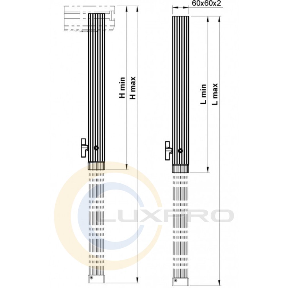 ширина - 87 мм;глубина - 76 мм;диаметр трубы - 60x60x2 мм;высота - 700-1200 мм.