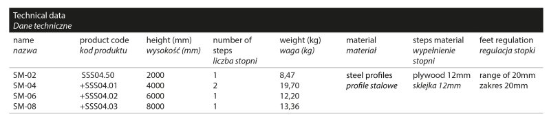 Модульная лестница SM-04 это две ступеньки высотой 20 см и 40 см, конструктивно имеет неизменную высоту ступеней (дополнительно можна приобрести ступени висотой 60 и 80 см). Оснащена основанием регулируемым по высоте, что позволяет установку данной лестницы на неровную поверхность.Характеристики: