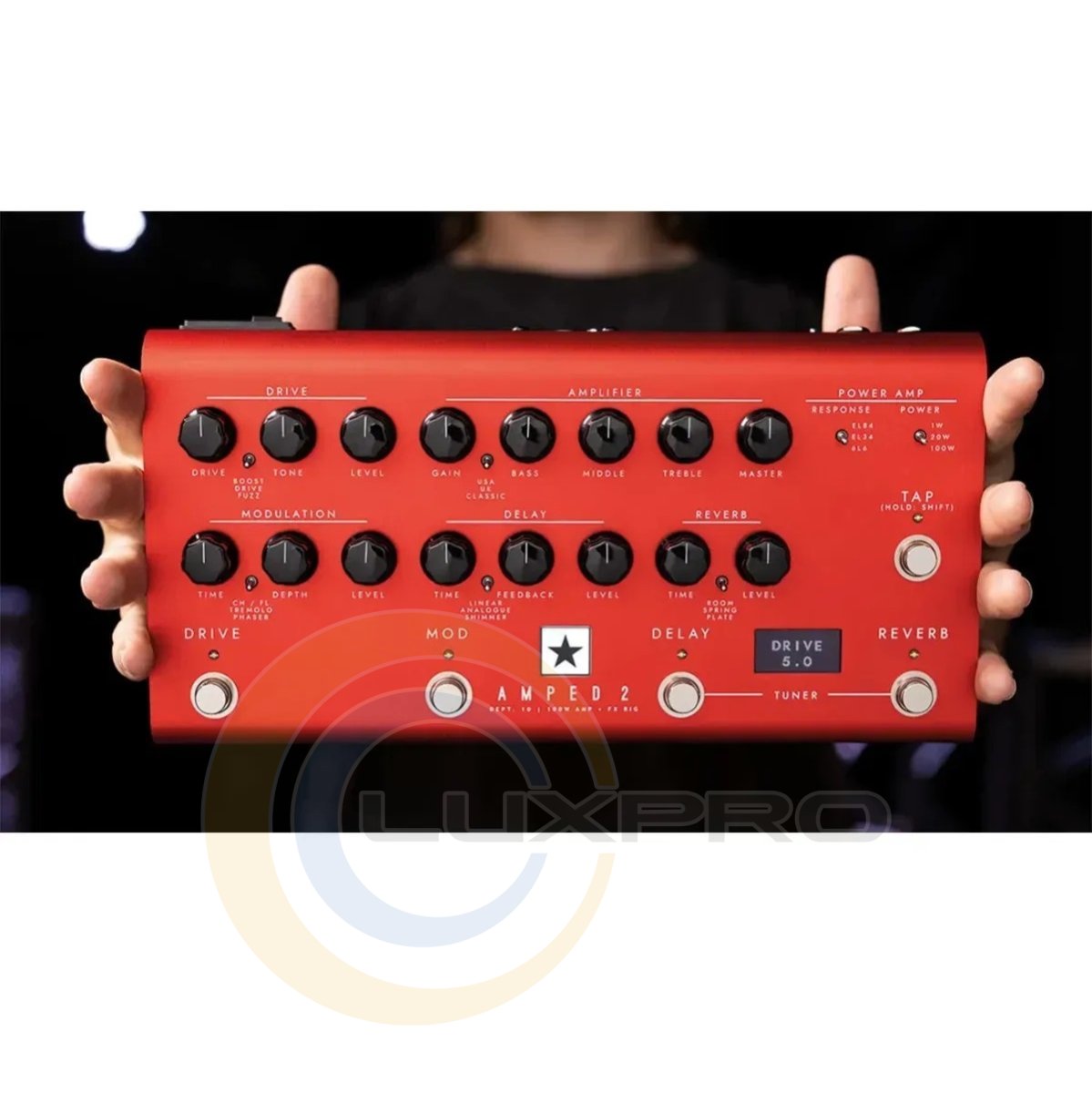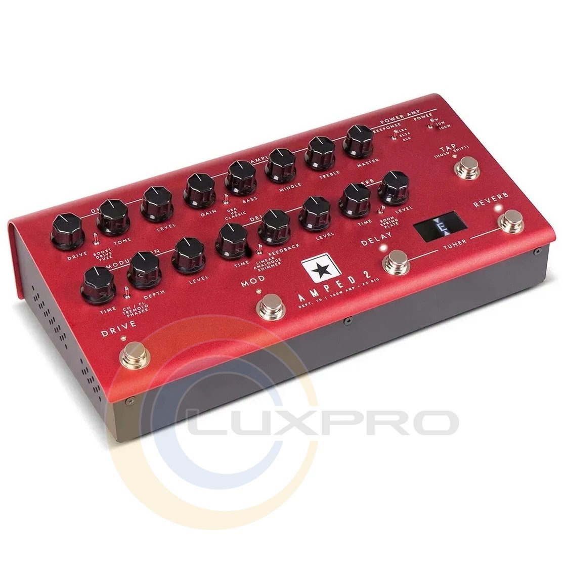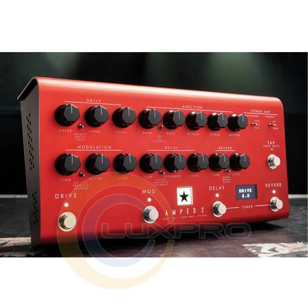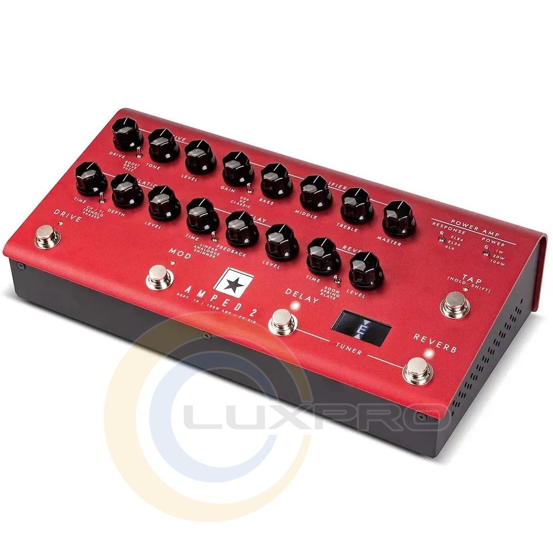 - Регуляторы: Drive; Drive, Tone, Level, Переключатель: Boost, Drive, Fuzz; Amplifier: Gain, Bass, Middle, Treble, Master, Переключатель: USA, UK, Classic; Modulation: Time, Depth, Level Переключатель: CH/FL, Tremolo, Phaser; Delay: Time, Feedback, Level, Переключатель: Linear, Analogue, Shimmer; Reverb: Time, Level, Переключатель: Room, Spring, Plate; Переключатель: Response, Power; Кнопки: Tap, Drive, Mod, Delay, Reverb;
