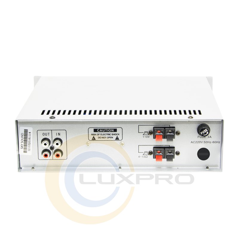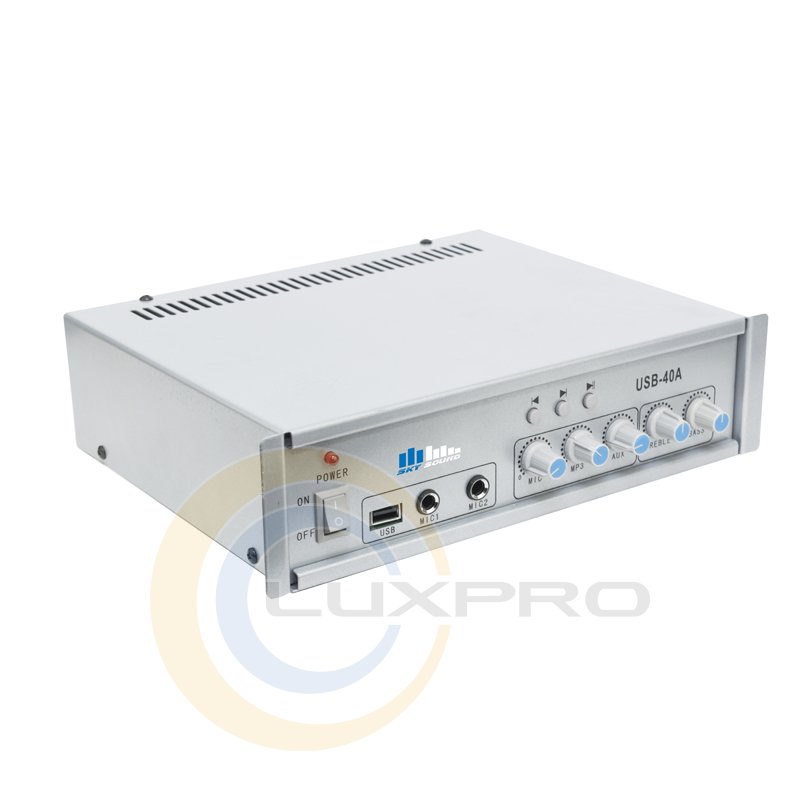 USB-40A - простой трансляционный усилитель. Оборудован встроенным трансформатором для для подключения 100В / 70В линий. Также присутствует выход для подключения обычных акустических систем сопротивлением 4-16 Ом. Благодаря наличию в данном усилителе встроенного источника звукового сигнала, возможно воспроизводить аудиофайлы из внешних USB-накопителей.