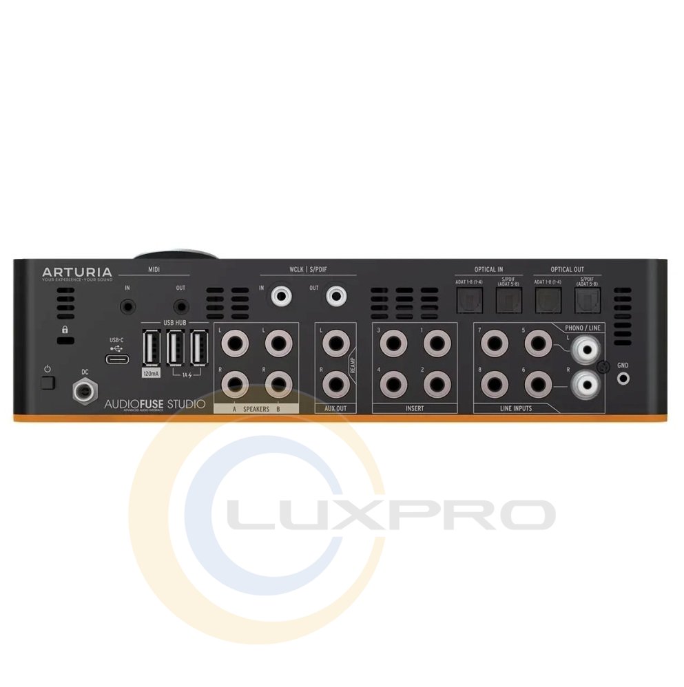 Комбинированные входы интерфейса работают в режимах Inst/Line/Mic, плюс доступны функции инвертирования фазы поступающего сигнала и подача фантомного питания. Кроме прочего, AudioFuse Studio оборудован 2 разъемами Phono/Line, 4 Insert-входами, L/R разъемами AUX OUT. Для вывода, посыла и обработки сигнала предусмотрены 4 выхода TRS, 8 цифровых ADAT входов/выходов, один S/PDIF вход/выход, MIDI IN/OUT и 3 USB порта.