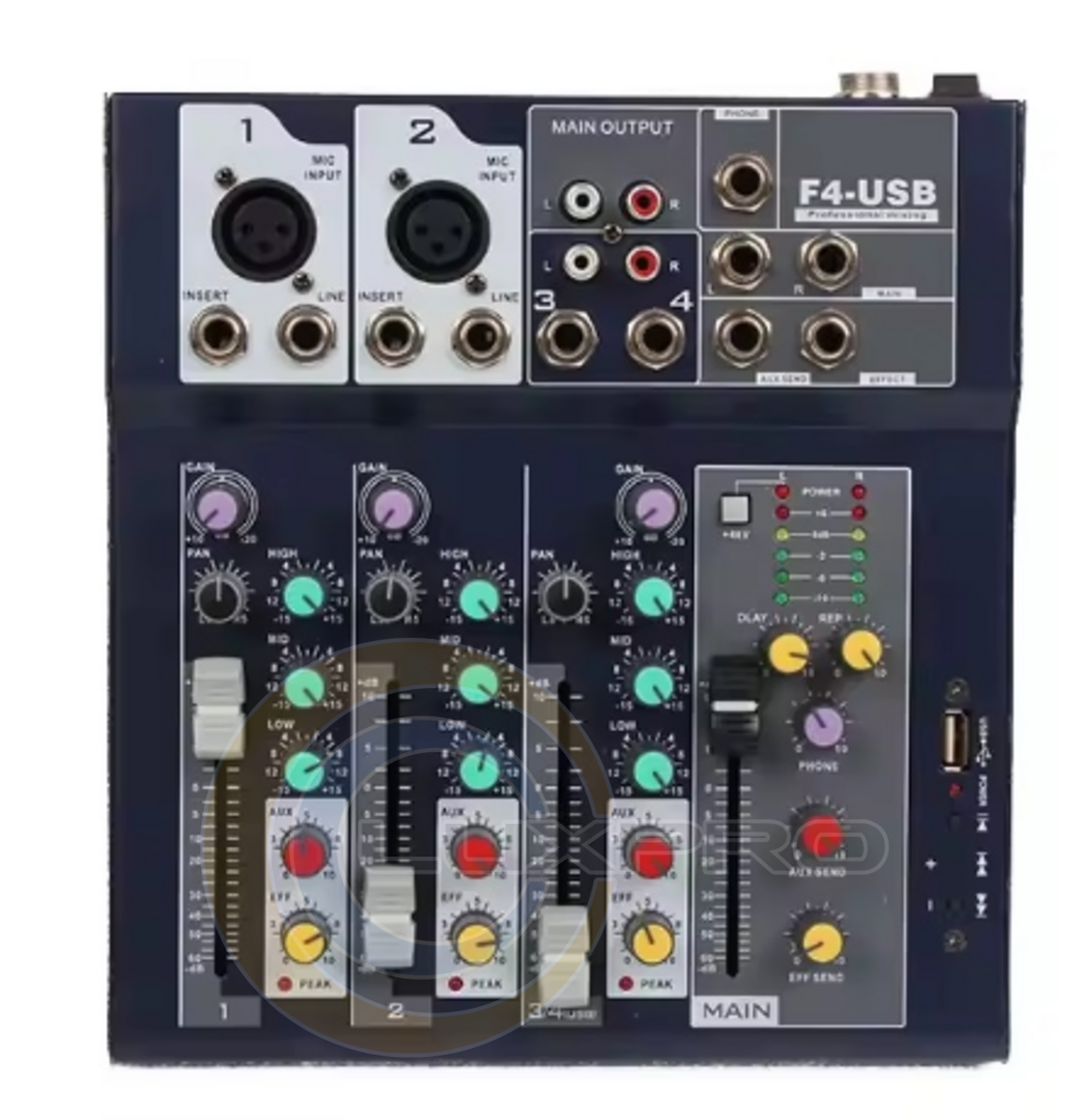 Микшерный пульт F4-USB это надежный 4-канальный компактный микшер с USB/MP3, фантомом, 3-полосным EQ и мощностью 13Вт. Идеальный выбор для тех, кто нуждается в чистом звуке в портативном корпусе без сложных функций.