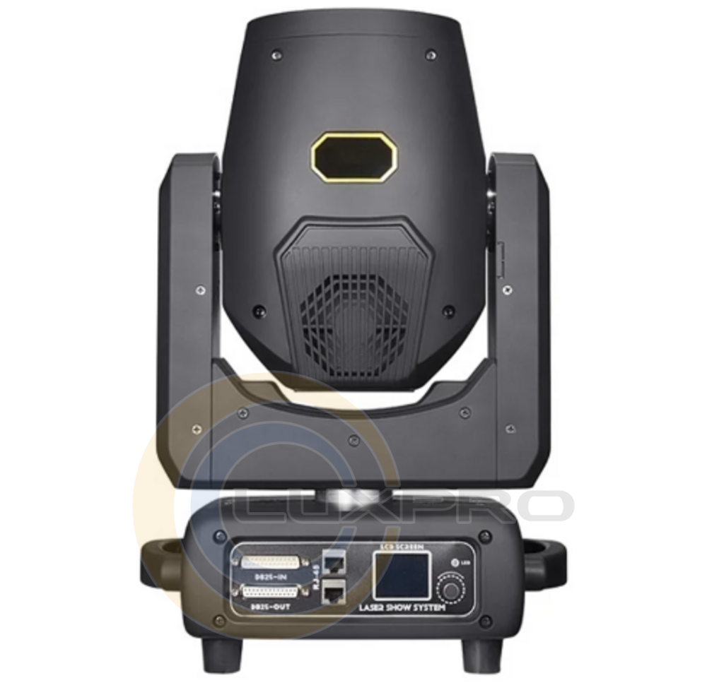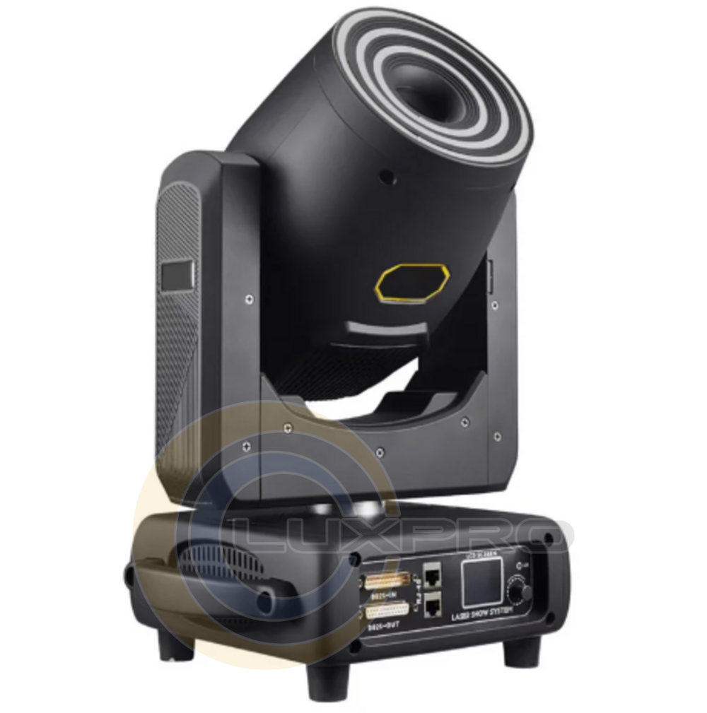 Лазерная голова S56 мощный лазерный проектор с номинальной мощностью 300 Вт и полноцветной RGB-подсветкой (10 Вт: красный 638 нм/3000 мВт, зелёный 525 нм/3000 мВт, синий 447 нм/4000 мВт), создающий 256 анимационных узоров. Устройство оснащено гальванометрической системой сканирования (30 KPPS, угол 20°), двумя двухфазными шаговыми двигателями (панорамирование 540° по оси X, наклон 270° по оси Y) и трехслойной светодиодной лентой Wheat Jazz для ярких визуальных эффектов.