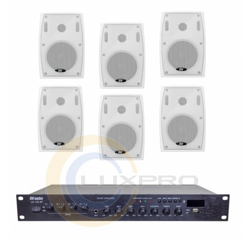 Комплект звука LA1206PB5W для помещения до 160 м.кв. Комплект предназначен для фонового озвучивания офисов, кафе, баров, ресторанов, спортивных залов, гостиничных комплексов и рассчитан на площадь помещения 160м². Особенностью данного комплекта является возможность применение его для озвучивания летних открытых площадок, террас, рыночных площадей и др.